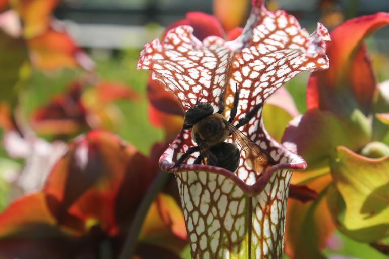 | Keywords: bee bumble pitcher plant su2016 uncw ecology bio366 #uncweteal uncweteal image2 may memorial day sarrancenia leucophylla bombus carnivorous stanley rehder garden outdoor nature pollinator pollen predator north carolina wilmington southeast usa This Memorial Day weekend I went for my first visit to the Stanley Rehder Carnivorous Plant Garden off of Independence Boulevard in Wilmington, North Carolina. I discovered an array of pitcher plants including the species pictured Sarrancenia Leucophylla. It was fascinating how many Bumble Bees or (Class: Insecta, Order: Hymenoptera, Family: Apidae, Genus: Bombus, and unsure of this species?) were flying around the plants and even crawling into them. I began to wonder if the bees had a strictly mutualistic relationship with the pitcher plants acting solely as pollinators. Also, I saw quite a few bees get stuck in the tubes of the pitcher plant and it appeared that the pitcher plant could be acting as a predator to the bees. Were the pitcher plants luring them into their tubes to provide a source of mineral nutrients for the plant? After doing some research, I found that it is not evolutionarily beneficial for pitcher plants to consume their own pollinators, thus why they have two distinct parts for each function. The flowering part of the pitcher plant (shown in the background of the photo) is the part responsible for attracting pollinators. This Memorial Day weekend I went for my first visit to the Stanley Rehder Carnivorous Plant Garden off of Independence Boulevard in Wilmington, North Carolina. I discovered an array of pitcher plants including the species pictured Sarrancenia Leucophylla. It was fascinating how many Bumble Bees or (Class: Insecta, Order: Hymenoptera, Family: Apidae, Genus: Bombus, and unsure of this species?) were flying around the plants and even crawling into them. I began to wonder if the bees had a strictly mutualistic relationship with the pitcher plants acting solely as pollinators. Also, I saw quite a few bees get stuck in the tubes of the pitcher plant and it appeared that the pitcher plant could be acting as a predator to the bees. Were the pitcher plants luring them into their tubes to provide a source of mineral nutrients for the plant? After doing some research, I found that it is not evolutionarily beneficial for pitcher plants to consume their own pollinators, thus why they have two distinct parts for each function. The flowering part of the pitcher plant (shown in the background of the photo) is the part responsible for attracting pollinators. |