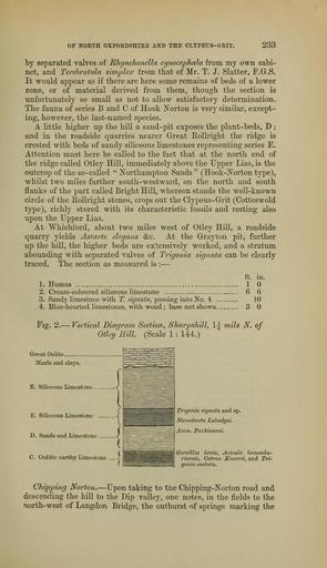 | Keywords: The Quarterly journal of the Geological Society of London (13204980744).jpg  OF NOKTH OXFORDSHIRE AND THE CLTPEUS-GRIT <br> 233 <br> by separated valves of Rhynclionella cynocephala from my own cabi- <br> net and Terebratula simplex from that of Mr T J Slatter F G S <br> It would appear as if there are here some remains of beds of a lower <br> zone or of material derived from them though the section is <br> unfortunately so small as not to allow satisfactory determination <br> The fauna of series B and C of Hook Norton is very similar except- <br> ing however the last-named species <br> A little higher up the hill a sand-pit exposes the plant-beds D ; <br> and in the roadside quarries nearer Great Rollright the ridge is <br> crested with beds of sandy siliceous limestones representing series E <br> Attention must here be called to the fact that at the north end of <br> the ridge called Otley Hill immediately above the Upper Lias is the <br> outcrop of the so-called Northampton Sands Hook-Norton type <br> whilst two miles further south-westward on the north and south <br> flanks of the part called Bright Hill whereon stands the well-known <br> circle of the Rollright stones crops out the Clypeus-Grit Cotteswold <br> type richly stored with its characteristic fossils and resting also <br> upon the Upper Lias <br> At Whichford about two miles west of Otley Hill a roadside <br> quarry yields Astarte elegans c At the Grayton pit further <br> up the hill the higher beds are extensively worked and a stratum <br> abounding with separated valves of Trigonia signata can be clearly <br> traced The section as measured is ” <br> ft in <br> 1 Humus 1 <br> 2 Cream-coloured siliceous limestone 6 6 <br> 3 Sanely limestone with T signata passing into No 4 10 <br> 4 Blue-hearted limestones with wood ; base not shown 3 <br> Fig 2 ” Vertical Diagram Section Sharpshill <br> Otley Hill Scale 1 144 <br> 1 mile JV~ of <br> Great Oolite <br> Marls and clays <br> E Siliceous Limestone <br> E Siliceous Limestone <br> D Sands and Limeston <br> C Oolitic earthy Limestone <br> Trigonia signata and sp <br> Monodonta Labadyei <br> Amm Parkinsoni <br> Gervillia Icevis Avicula braambu- <br> riensis Ostrea Knorrii and Tri- <br> gonia costata <br> Chipping Norton ” Upon taking to the Chipping-Norton road and <br> descending the hill to the Dip valley one notes in the fields to the <br> Bridge the outburst of springs marking the <br> north-west of Langdon 36928830 113681 51125 Page 233 Text 39 http //www biodiversitylibrary org/page/36928830 1883 Geological Society of London NameFound Astarte elegans NameFound Avicula NameConfirmed Avicula EOLID 10721231 NameBankID 4633901 NameFound Gervillia NameConfirmed Gervillia NameBankID 4176998 NameFound Monodonta NameConfirmed Monodonta EOLID 58116 NameBankID 4934925 NameFound Ostrea NameConfirmed Ostrea EOLID 10719983 NameBankID 2692450 NameFound Rhynclionella cynocephala NameConfirmed Rhynchonella cynocephala NameFound Terebratula simplex NameConfirmed Terebratula simplex NameBankID 6808509 NameFound Trigonia signata Biodiversity Heritage Library The Quarterly journal of the Geological Society of London v 39 1883 Geology Periodicals Smithsonian Libraries bhl page 36928830 dc identifier http //biodiversitylibrary org/page/36928830 smithsonian libraries Information field Flickr posted date ISOdate 2014-03-16 Check categories 2015 August 26 CC-BY-2 0 BioDivLibrary https //flickr com/photos/61021753 N02/13204980744 2015-08-26 13 54 27 cc-by-2 0 PD-old-70-1923 The Quarterly journal of the Geological Society of London 1883 Photos uploaded from Flickr by Fæ using a script |