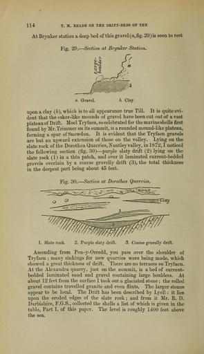 Keywords: The Quarterly journal of the Geological Society of London (13204569035).jpg 114 T M READE OX THE DEIFT-BEDS OF THE <br> At Brynker station a deep bed of this gravel a fig 29 is seen to rest <br> Fig 29 ” Section at Brynker Station <br> a Gravel <br> b Clay <br> upon a clay o which is to all appearance true Till It is quite evi- <br> dent that the esker-like mounds of gravel have been cut out of a vast <br> plateau of Drift Moel Tryfaen so celebrated for the marine shells first <br> found by Mr Trimmer on its summit is a rounded mound-like plateau <br> forming a spur of Snowdon It is evident that the Tryfaen gravels <br> are but an upward extension of those on the valley Lying on the <br> slate rock of the Dorothea Quarries Nantley valley in 1872 1 noticed <br> the following section fig 30 ” purple slaty drift 2 lying on the <br> slate rock 1 in a thin patch and over it laminated current-bedded <br> o-ravels overlain by a coarse gravelly drift 3 the total thickness <br> in the deepest part being about 45 feet <br> Fig 30 ” Section at Dorothea Quarries <br> 1 Slate rock 2 Purple slaty drift 3 Coarse gravelly drift <br> Ascending from Pen-y-Orredd you pass over the shoulder of <br> Tryfaen ; many sinkings for new quarries were being made which <br> showed a great thickness of drift There are no terraces on Tryfaen <br> At the Alexandra quarry just on the summit is a bed of current- <br> bedded laminated sand and gravel containing large boulders At <br> about 12 feet from the surface I took out a glaciated stone ; the rolled <br> gravel contains travelled granite and even flints The larger stones <br> appear to be local The Drift has been described by Lyell it lies <br> upon the eroded edges of the slate rock ; and from it Mr E D <br> Darbishire F Gr S collected the shells a list of which is given in the <br> table Part I of this paper The level is roughly 1400 feet above <br> the sea 36928695 113681 51125 Page 114 Text 39 http //www biodiversitylibrary org/page/36928695 1883 Geological Society of London Biodiversity Heritage Library The Quarterly journal of the Geological Society of London v 39 1883 Geology Periodicals Smithsonian Libraries bhl page 36928695 dc identifier http //biodiversitylibrary org/page/36928695 smithsonian libraries Information field Flickr posted date ISOdate 2014-03-16 Check categories 2015 August 26 CC-BY-2 0 BioDivLibrary https //flickr com/photos/61021753 N02/13204569035 2015-08-26 13 56 53 cc-by-2 0 PD-old-70-1923 The Quarterly journal of the Geological Society of London 1883 Photos uploaded from Flickr by FĂŚ using a script