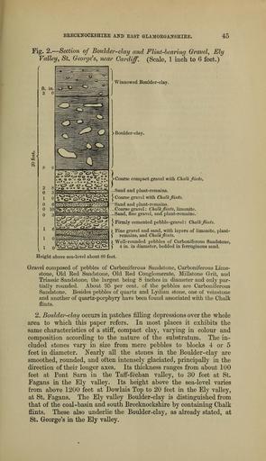 | Keywords: The Quarterly journal of the Geological Society of London (13204465145).jpg BKECKNOCKSBXRE AND EAST GLAMOKGANSHIKE <br> 45 <br> Fig 2 Section of Boulder-clay and Flint-bearing Gravel Ely <br> Valley St George's near Cardiff Scale 1 inch to 6 feet <br> Winnowed Boulder-clay <br> Boulder-clay <br> Coarse compact gravel with Chalk flints <br> Sand and plant-remains <br> Coarse gravel with Chalk flints <br> ' Sand and plant-remains <br> Coarse gravel Chalk flints limonite <br> Sand fine gravel and plant-remains <br> Firmly cemented pebble-gravel Chalk flints <br> 6 'fi lf m I Fine S ravel and sand ' i 11 la y er s of limonite plant- <br> remains and Chalk flints <br> Well-rounded pebbles of Carboniferous Sandstone <br> 4 in in diameter bedded in ferruginous sand <br> Height above sea-level about 80 feet <br> Gravel composed of pebbles of Carboniferous Sandstone Carboniferous Lime- <br> stone Old Red Sandstone Old Eed Conglomerate Millstone Grit and <br> Triassic Sandstone - the largest being 8 inches in diameter and only par- <br> tially rounded About 95 per cent of the pebbles are Carboniferous <br> Sandstone Besides pebbles of quartz and Lydian stone one of veinstone <br> and another of quartz-porphyry have been found associated with the Chalk <br> flints <br> 2 Boulder-clay occurs in patches filling depressions over the whole <br> area to which this paper refers In most places it exhibits the <br> same characteristics of a stiff compact clay varying in colour and <br> composition according to the nature of the substratum The in- <br> cluded stones vary in size from mere pebbles to blocks 4 or 5 <br> feet in diameter Nearly all the stones in the Boulder-clay are <br> smoothed rounded and often intensely glaciated principally in the <br> direction of their longer axes Its thickness ranges from about 100 <br> feet at Pont Sarn in the Taff-fechan valley to 30 feet at St <br> Eagans in the Ely valley Its height above the sea-level varies <br> from above 1200 feet at Dowlais Top to 20 feet in the Ely valley <br> at St Fagans The Ely valley Boulder-clay is distinguished from <br> that of the coal -basin and south Brecknockshire by containing Chalk <br> flints These also underlie the Boulder-clay as already stated at <br> St George's in the Ely valley 36928622 113681 51125 Page 45 Text 39 http //www biodiversitylibrary org/page/36928622 1883 Geological Society of London Biodiversity Heritage Library The Quarterly journal of the Geological Society of London v 39 1883 Geology Periodicals Smithsonian Libraries bhl page 36928622 dc identifier http //biodiversitylibrary org/page/36928622 smithsonian libraries Information field Flickr posted date ISOdate 2014-03-16 Check categories 2015 August 26 CC-BY-2 0 BioDivLibrary https //flickr com/photos/61021753 N02/13204465145 2015-08-26 13 53 40 cc-by-2 0 PD-old-70-1923 The Quarterly journal of the Geological Society of London 1883 Photos uploaded from Flickr by FĂŚ using a script |