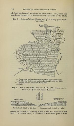 Keywords: The Quarterly journal of the Geological Society of London (13071225334).jpg 46 <br> PROCEEDINGS OF THE GEOLOGICAL SOCIETY <br> of about one hundred feet above the river-surface ; and when mea- <br> sured from the summit of Boulder-clay on the north to the Chalk- <br> Fig I ”Geological Shetch Map of part of the Valley of the Little <br> Oiise River <br> Fits 1 / Dournkc <br> Ration'/ <br> a Ferruginous sands and coarse flint-gravel 12 to 15 feet thick <br> b Boulder-clay in blue and laminated strata 25 to 30 feet thick <br> b b Boulder-clay not laminated 20 feet thick <br> c Chalk <br> Fig 2 ” Section across the Little Ouse Valley at the second standi <br> between Thetford and Santon Downham <br> Brick-kiln on the <br> Miindford-road <br> Vertical scale 1 inch to 300 feet Horizontal scale H inch to 1 mile <br> summit on the south the valley is from a mile to a mile and a half <br> wide On the south side to the extent of three miles parallel with 36344771 112028 51125 Page 46 Text v 23 http //www biodiversitylibrary org/page/36344771 1867 Geological Society of London NameFound Ferruginous Biodiversity Heritage Library The Quarterly journal of the Geological Society of London v 23 1867 Geology Periodicals Smithsonian Libraries bhl page 36344771 dc identifier http //biodiversitylibrary org/page/36344771 smithsonian libraries Information field Flickr posted date ISOdate 2014-03-10 Check categories 2015 August 26 CC-BY-2 0 BioDivLibrary https //flickr com/photos/61021753 N02/13071225334 2015-08-26 14 53 09 cc-by-2 0 PD-old-70-1923 The Quarterly journal of the Geological Society of London 1867 The Quarterly journal of the Geological Society of London 1867 Photos uploaded from Flickr by Fæ using a script |
