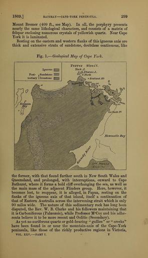 | Keywords: The Quarterly journal of the Geological Society of London (12961318793).jpg 1869 <br> KATTHAY CAPE-YOKK PENINSULA <br> 299 <br> Mount Bremer 409 ft see Map In all the porphyry presents <br> nearly the same lithological characters and consists of a matrix of <br> felspar enclosing numerous crystals of yellowish quartz Wear Cape <br> York it is laminated <br> Besting on the eastern and western flanks of this igneous axis are <br> thick and extensive strata of sandstone doubtless continuous like <br> Fig 1 ” Geological Majo of Cape York <br> Igneous pp <br> Post- I Sandstone l <br> tertiary Ironstone <br> Torres Stra i t <br> York I <br> i horac I <br> C Yorls <br> s Sextant J <br> the former with that found further south in New South Wales and <br> Queensland and prolonged with interruptions onward to Cape <br> Bathurst where it forms a bold cliff overhanging the sea as well as <br> the main mass of the adjacent Flinders group Here however it <br> becomes lost to reappear it is alleged in Papua resting on the <br> flanks of the igneous axis of that island itself a continuation of <br> that of Eastern Australia across the intervening strait which is only <br> 90 miles mde The nature of this sedimentary rock has long been <br> disputed the Bev W B Clarke and his followers maintaining that <br> it is Carboniferous Palaeozoic while Professor M Coy and his adhe- <br> rents believe it to be more recent and Oolitic Secondary <br> As yet no auriferous quartz or gold-bearing gullies or creeks <br> have been found in or near the mountain-axis of the Cape- York <br> peninsula like those of the richly productive regions in Victoria <br> VOL XXV PAKT I - – T 36103146 111288 51125 Page 299 Text v 25 http //www biodiversitylibrary org/page/36103146 1869 Geological Society of London NameFound Victoria NameConfirmed Victoria EOLID 34123 NameBankID 897688 Biodiversity Heritage Library The Quarterly journal of the Geological Society of London v 25 1869 Geology Periodicals Smithsonian Libraries bhl page 36103146 dc identifier http //biodiversitylibrary org/page/36103146 smithsonian libraries Information field Flickr posted date ISOdate 2014-03-06 Check categories 2015 August 26 CC-BY-2 0 BioDivLibrary https //flickr com/photos/61021753 N02/12961318793 2015-08-26 15 56 08 cc-by-2 0 PD-old-70-1923 The Quarterly journal of the Geological Society of London 1869 Photos uploaded from Flickr by Fæ using a script |