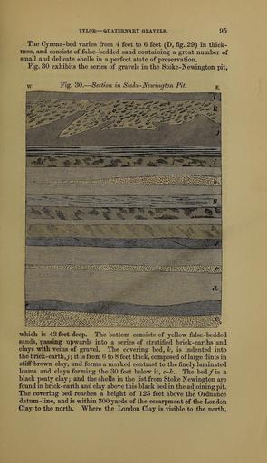 | Keywords: The Quarterly journal of the Geological Society of London (12961519584).jpg TYLOR QUATEENAEY GRAVELS <br> 95 <br> The Cyrena-bed varies from 4 feet to 6 feet D fig 29 in thick- <br> ness and consists of false-bedded sand containing a great number of <br> small and delicate shells in a perfect state of preservation <br> Fig 30 exhibits the series of gravels in the Stoke-Newington pit <br> w <br> Pig 30 ” Section in StoTce-Newington Pit <br> vrhich is 43 feet deep The bottom consists of yellow false-bedded <br> sands passing upwards into a series of stratified brick-earths and <br> clays with veins of gravel The covering bed Jc is indented into <br> the brick-earth ; it is from 6 to 8 feet thick composed of large flints in <br> stiff brown clay and forms a marked contrast to the finely laminated <br> loams and clays forming the 30 feet below it c-Tc The bed / is a <br> black peaty clay; and the shells in the list from Stoke Newington are <br> found in brick-earth and clay above this black bed in the adjoining pit <br> The covering bed reaches a height of 125 feet above the Ordnance <br> datum-line and is within 300 yards of the escarpment of the London <br> Clay to the north Where the London Clay is visible to the north 36102940 111288 51125 Page 95 Text v 25 http //www biodiversitylibrary org/page/36102940 1869 Geological Society of London Biodiversity Heritage Library The Quarterly journal of the Geological Society of London v 25 1869 Geology Periodicals Smithsonian Libraries bhl page 36102940 dc identifier http //biodiversitylibrary org/page/36102940 smithsonian libraries Information field Flickr posted date ISOdate 2014-03-06 Check categories 2015 August 26 CC-BY-2 0 BioDivLibrary https //flickr com/photos/61021753 N02/12961519584 2015-08-26 15 55 32 cc-by-2 0 PD-old-70-1923 The Quarterly journal of the Geological Society of London 1869 Photos uploaded from Flickr by Fæ using a script |