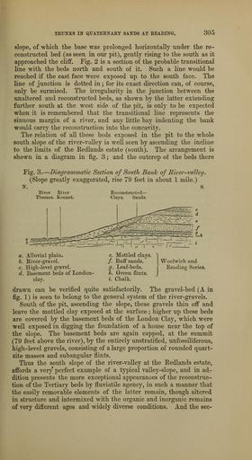 | Keywords: The Quarterly journal of the Geological Society of London (12960254243).jpg TET7NKS IN QUATEENARY SANDS AT READING <br> 305 <br> slope of which the base was prolonged horizontally under the re- <br> constructed bed as seen in our pit gently rising to the south as it <br> approached the cliff Fig 2 is a section of the probable transitional <br> line with the beds north and south of it Such a line would be <br> reached if the east face were exposed up to the south face The <br> line of junction is dotted in ; for its exact direction can of course <br> only be surmised The irregularity in the junction between the <br> unaltered and reconstructed beds as shown by the latter extending <br> further south at the west side of the pit is only to be expected <br> when it is remembered that the transitional line represents the <br> sinuous margin of a river and any little bay indenting the bank <br> would carry the reconstruction into the concavity <br> The relation of all these beds exposed in the pit to the whole <br> south slope of the river-valley is well seen by ascending the incline <br> to the limits of the Eedlands estate south The arrangement is <br> shown in a diagram in fig 3 ; and the outcrop of the beds there <br> Fig 3 ” Diagrammatic Section of South Bank of River-valley <br> Slope greatly exaggerated rise 79 feet in about 1 mile <br> N S <br> Reconstructed ” <br> Claya Sands <br> River River <br> Thames Kennet <br> a Alluvial plain <br> b River-graTel <br> c High-level gravel <br> d Basement beds of London- <br> clay <br> e Mottled clays <br> / Buff sands I Woolwich and <br> g Leaf-beds I Beading Series <br> h Greeu flints J <br> i Chalk <br> drawn can be verified quite satisfactorily The gravel-bed A in <br> fig 1 is seen to belong to the general system of the river-gravels <br> South of the pit ascending the slope these gravels thin off and <br> leave the mottled clay exposed at the surface ; higher up these beds <br> are covered by the basement beds of the London Clay which were <br> well exposed in digging the foundation of a house near the top of <br> the slope The basement beds are again capped at the summit <br> 79 feet above the river by the entirely unstratified unfossiliferous <br> high-level gravels consisting of a large proportion of rounded quart- <br> zite masses and subangular flints <br> Thus the south slope of the river-valley at the Eedlands estate <br> affords a very perfect example of a typical valley-slope and in ad- <br> dition presents the more exceptional aj pearances of the reconstruc- <br> tion of the Tertiary beds by fluviatile agency in such a manner that <br> the easily removable elements of the latter remain though altered <br> in structure and intermixed with the organic and inorganic remains <br> of very different ages and widely diverse conditions And the sec- 36090664 111264 51125 Page 305 Text 36 http //www biodiversitylibrary org/page/36090664 1880 Geological Society of London Biodiversity Heritage Library The Quarterly journal of the Geological Society of London v 36 1880 Geology Periodicals Smithsonian Libraries bhl page 36090664 dc identifier http //biodiversitylibrary org/page/36090664 smithsonian libraries Information field Flickr posted date ISOdate 2014-03-06 Check categories 2015 August 26 CC-BY-2 0 BioDivLibrary https //flickr com/photos/61021753 N02/12960254243 2015-08-26 15 51 07 cc-by-2 0 PD-old-70-1923 The Quarterly journal of the Geological Society of London 1880 Photos uploaded from Flickr by Fæ using a script |