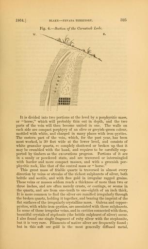 | Keywords: The Quarterly journal of the Geological Society of London (12895417644).jpg 1864 <br> BLAKE NEVADA TERRITORY <br> Fig 4 Section of the Comstock Lode <br> 325 <br> w <br> It is divided into two portions at the level by a porphyritic mass <br> or horse which will probably thin out in depth and the two <br> parts of the vein will then become united in one The walls on <br> each side are compact porphyry of an olive or greyish -green colour <br> mottled with white and charged in many places with iron-pyrites <br> The eastern part of the vein which for the past year has been <br> most worked is 30 feet wide at the lower level and consists of <br> white granular quartz so complely shattered or broken up that it <br> may be crumbled with the hand and requires to be carefully sup- <br> ported by timbers as the excavations progress Portions of it are <br> in a sandy or powdered state and are traversed or intermingled <br> with harder and more compact masses and with a greenish por- <br> phyritic rock like that of the central mass or horse <br> This great mass of friable quartz is traversed in almost every <br> direction by veins or streaks of the richest sulphurets of silver both <br> brittle and sectile and with free gold in irregular ragged grains <br> These veins or masses seldom reach a thickness of more than two or <br> three inches and are often merely crusts or coatings or seams in <br> the quartz and are from one-tenth to one-eighth of an inch thick <br> It is more common to find the silver ore ramified irregularly through <br> the broken quartz holding it together and bearing the imprint of the <br> flat surfaces of the irregularly crystalline mass Galena and copper- <br> pyrites with white iron-pyrites are associated with these sulphurets <br> In some of these irregular veins and in cavities connected with them <br> beautiful crystals of stephanite the brittle sulphuret of silver occur <br> I also found one single fragment of ruby silver with the stephanite <br> but it is very rare Filaments of native silver are frequently found ; <br> but in this soft ore gold is the most generally diffused metal 36089588 111261 51125 Page 325 Text v 20 http //www biodiversitylibrary org/page/36089588 1864 Geological Society of London Biodiversity Heritage Library The Quarterly journal of the Geological Society of London v 20 1864 Geology Periodicals Smithsonian Libraries bhl page 36089588 dc identifier http //biodiversitylibrary org/page/36089588 smithsonian libraries Information field Flickr posted date ISOdate 2014-03-03 Check categories 2015 August 26 CC-BY-2 0 BioDivLibrary https //flickr com/photos/61021753 N02/12895417644 2015-08-26 16 51 07 cc-by-2 0 PD-old-70-1923 The Quarterly journal of the Geological Society of London 1864 Photos uploaded from Flickr by FĂŚ using a script |