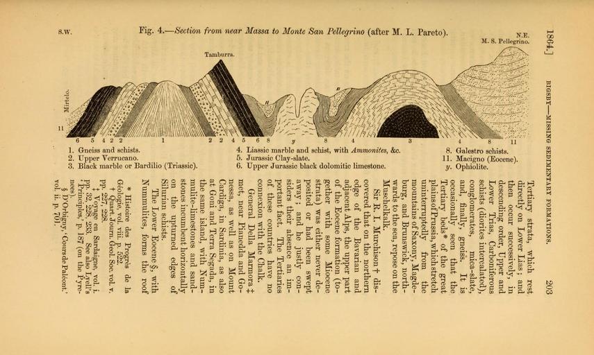 | Keywords: The Quarterly journal of the Geological Society of London (12895324314).jpg 1864 <br> BIGSBY MISSING SEDIMENTARY FORMATIONS <br> 203 <br> opjuijn <br> 2 © <br> Tertiary strata which rest <br> directly on Lower Lias ; and <br> then occur successively in <br> descending order Upper and <br> Lower Trias Carboniferous <br> schists diorites intercalated <br> conglomerates mica-slate <br> and finally gneiss It is <br> occasionally seen that the <br> Tertiary beds of the great <br> plains of Prussia which stretch <br> uninterruptedly from the <br> mountains of Saxony Magde- <br> burg and Brunswick north- <br> wards to the sea repose on the <br> Muschelkalk <br> Sir R I Murchisonf dis- <br> covered that on the northern <br> edge of the Bavarian and <br> adjacent Alps the upper part <br> of the Eocene formation to- <br> gether with some Miocene <br> strata was either never de- <br> posited or had been swept <br> away ; and he justly con- <br> siders their absence an im- <br> portant fact The Tertiaries <br> of these countries have no <br> connexion with the Chalk <br> General Delia Marmora £ <br> met near Pianedda and Go- <br> nessa as well as on Mount <br> Cardiga in Sardinia as also <br> at Goni and Terra Segada in <br> the same island with Num- <br> mulite-limestones and sand- <br> stones incumbent horizontally <br> on the upturned edges of <br> Silurian schists <br> The Lower Eocene § with <br> Nummulites forms the roof <br> Histoire des Progres de la <br> Geologie vol viii p 522 <br> t Quart Journ Geol Soc vol v <br> pp 227 228 <br> I Voyage en Sardaigne vol i <br> pp 32 228 233 See also Lyell's <br> ' Principles ' p 187 on the Pyre- <br> nees <br> § D'Orbigny 'CoursdePaleont' <br> vol ii p 701 36089446 111261 51125 Page 203 Text v 20 http //www biodiversitylibrary org/page/36089446 1864 Geological Society of London NameFound Nummulites NameConfirmed Nummulites EOLID 6817785 NameBankID 3399048 Biodiversity Heritage Library The Quarterly journal of the Geological Society of London v 20 1864 Geology Periodicals Smithsonian Libraries bhl page 36089446 dc identifier http //biodiversitylibrary org/page/36089446 smithsonian libraries Information field Flickr posted date ISOdate 2014-03-03 Check categories 2015 August 26 CC-BY-2 0 BioDivLibrary https //flickr com/photos/61021753 N02/12895324314 2015-08-26 16 58 57 cc-by-2 0 PD-old-70-1923 The Quarterly journal of the Geological Society of London 1864 Photos uploaded from Flickr by Fæ using a script |