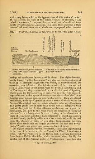 | Keywords: The Quarterly journal of the Geological Society of London (12894973253).jpg 1864 <br> MURCHISON AND HARKNESS PERMIAN <br> 149 <br> which may be regarded as the type-section of this series of rocks <br> In this section the base of the series consists of breccias locally <br> called brockrams composed for the most part of unaltered frag- <br> ments of Carboniferous Limestone To these there succeeds a thick <br> mass of red sandstones upon which are superposed other breccias <br> Pig 1 ” Generalized Section of the Permian Rocks of the Eden Valley <br> w <br> Inferior <br> unaltered <br> Breccia <br> 1 Penrith Sandstone Lower Permian 2 Hilton plant-beds Middle Permian <br> 3 Corby or St Bees Sandstone Upper 4 Lower Silurian <br> Permian <br> having red sandstones intercalated in them The higher breccias <br> locally termed rotten brockrams are also to a considerable extent <br> made up of limestone -fragments but which in every instance are <br> converted into dolomite The inferior unaltered breccias are not <br> seen in Cumberland in connexion with the Penrith sandstones ; and <br> in Westmoreland they are confined to the district west of Appleby <br> where alone the lowest portion of this series is seen The succeed- <br> ing sandstones which spread themselves over the whole of the Lower <br> Permian area possess peculiar mineral characters They are almost <br> exclusively made up of grains of quartz many of which retain the <br> facets of the original quartz-crystals reflecting solar rays therefrom <br> The quartz grains are of more than usual size as compared with <br> that of the particles of other siliceous sandstones are angular or <br> subangular and give to the rocks which are composed of them the <br> nature of a very fine-grained breccia Owing to the abundance of <br> oxide of iron these sandstones have commonly a bright-red colour ; <br> but occasionally perfectly white strata are associated with the red <br> beds the absence of oxide of iron alone distinguishing the two <br> These white sandstones are largely quarried to the east and north- <br> east of Penrith and many new houses are built of them <br> The higher breccias rotten brockrams like those appertaining <br> to the base of the series are in the Yale of the Eden of local occur- <br> rence They are well seen in the Hilton-beck a stream descending <br> from Roman Fell to the Eden which traverses along the dip the <br> greater part of the Permian rocks of Westmoreland ; and they also <br> Op cit supra p 207 36089390 111261 51125 Page 149 Text v 20 http //www biodiversitylibrary org/page/36089390 1864 Geological Society of London Biodiversity Heritage Library The Quarterly journal of the Geological Society of London v 20 1864 Geology Periodicals Smithsonian Libraries bhl page 36089390 dc identifier http //biodiversitylibrary org/page/36089390 smithsonian libraries Information field Flickr posted date ISOdate 2014-03-03 Check categories 2015 August 26 CC-BY-2 0 BioDivLibrary https //flickr com/photos/61021753 N02/12894973253 2015-08-26 16 52 32 cc-by-2 0 PD-old-70-1923 The Quarterly journal of the Geological Society of London 1864 Photos uploaded from Flickr by Fæ using a script |
