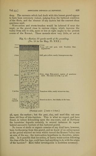 | Keywords: The Quarterly journal of the Geological Society of London (12893724993).jpg  Vol 53- <br> ASSOCIATED DEPOSITS AT NEWBURY <br> 429 <br> deep The currents which had dealt with this lowest gravel appear <br> to have been extremely violent judging from the battered condition <br> of the flints and the absence of any matrix but the coarsest clean <br> quartzose sand <br> Wave-action and storm-beaches would be inferred if near the <br> coast as the gravel rises in curious ridges which traverse the <br> valley from side to side more or less at right angles to the present <br> course of the Kennet These mounds show very little or not at <br> Kg 6 <br> 1 foot <br> 2 feet <br> 6 feet <br> 5 inches <br> 3 feet <br> exposed <br> ”Section 30 yards north of the preceding <br> No 10 in the Map PL XXX <br> Peaty soil and peat with Neolithic flint- <br> implements <br> Stiff pale-yellow sandy homogeneous clay <br> G-rey clean flint-gravel matrix of quartzose <br> sand The same as in fig 5 p 428 <br> Tenacious white sandy micaceous clay <br> Gravel as above but chalky at the base <br> Vertical scale 5 inch 1 foot <br> all upon the surface ; but the peat clay and marl thin out over <br> these old lines of lake-barriers This is what we expect and have <br> found in valleys debouching upon the sea-coast ; and at Newbury <br> the lacustrine deposits certainly in several instances do repose <br> behind successive barriers of this battered gravel <br> No traces of shells or organic remains of any kind have however <br> been forthcoming from this gravel and we know of no submergence <br> at the period whereof we treat which turned the Kennet Valley into <br> an arm of the sea ; the wave-action hypothesis is therefore unten- <br> able Is it possible that ice-action or heavy water-action following <br> the close of the Ice Age could have had anything to do with the origin <br> of the barriers Here fuller investigation is doubtless necessary 36029252 111130 51125 Page 429 Text 53 http //www biodiversitylibrary org/page/36029252 1897 Geological Society of London Biodiversity Heritage Library The Quarterly journal of the Geological Society of London v 53 1897 Geology Periodicals Smithsonian Libraries bhl page 36029252 dc identifier http //biodiversitylibrary org/page/36029252 smithsonian libraries Information field Flickr posted date ISOdate 2014-03-03 Check categories 2015 August 26 CC-BY-2 0 BioDivLibrary https //flickr com/photos/61021753 N02/12893724993 2015-08-26 16 57 24 cc-by-2 0 PD-old-70-1923 The Quarterly journal of the Geological Society of London 1897 Photos uploaded from Flickr by Fæ using a script |