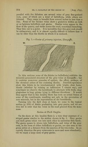 | Keywords: The Quarterly journal of the Geological Society of London (12893678443).jpg 354 <br> DE C CALLAWAY ON THE OKIGLN OF <br> Aug 1897 <br> parallel with the foliation are several veins of grey fine-grained <br> rock some of which are a kind of halleflinta while others are <br> foliated They range in breadth from several inches to less than a <br> line Some of the thicker veins show a gradation within an inch <br> or so between halleflinta and gneiss Similar veins appear in the <br> floor of the quarry and strike across the road sometimes branching <br> They thin out to a point It is incredible that this grey rock should <br> be sedimentary and it is almost equally difficult to believe that it <br> can be older than the diorite in which it is enclosed <br> Fig 1 ” Gneiss of primary injection Llanyaffo <br> w - _______ E- <br> In thin sections some of the felsite or halleflinta exhibits the <br> minutely-granulated structure of the grey veins at Llangaffo ; but <br> it contains numerous granules of epidote the effect perhaps of <br> the chemical action of the enclosing diorite Junction-specimens <br> show this felsite to be interlaminated with bright clear horn- <br> blende whether by veining or infiltration I cannot say and <br> sometimes we observe the hornblende to alternate with fresh clear <br> plagioclase in long prisms lying in different directions It would <br> thus appear that in this locality there has been an actual fusion of <br> some of the constituents resulting not only in the generation of <br> new minerals but in the regeneration of the hornblende <br> Turning into the field close at hand we come to the typical <br> section p 356 of felsite graduating into grey gneiss and we are <br> thus led to infer that the veins in the road proceed from the same <br> Section at Forth Gwyfen <br> On the shore at this locality there is a very clear exposure of a <br> striped gneiss similar to the section shown in fig 1 Grey gneiss <br> and dark-green schist run into each other in numerous thin bands <br> The gneiss passes in places into halleflinta and veins of the grey <br> rock in the form of either halleflinta or gneiss are also seen in the <br> green schist at a distance from the junction of the two rocks In an <br> easterly direction the grey veins come in more and more abundantly <br> till we reach a large mass of grey gneiss 36029163 111130 51125 Page 354 Text 53 http //www biodiversitylibrary org/page/36029163 1897 Geological Society of London Biodiversity Heritage Library The Quarterly journal of the Geological Society of London v 53 1897 Geology Periodicals Smithsonian Libraries bhl page 36029163 dc identifier http //biodiversitylibrary org/page/36029163 smithsonian libraries Information field Flickr posted date ISOdate 2014-03-03 Check categories 2015 August 26 CC-BY-2 0 BioDivLibrary https //flickr com/photos/61021753 N02/12893678443 2015-08-26 17 53 50 cc-by-2 0 PD-old-70-1923 The Quarterly journal of the Geological Society of London 1897 Photos uploaded from Flickr by Fæ using a script |