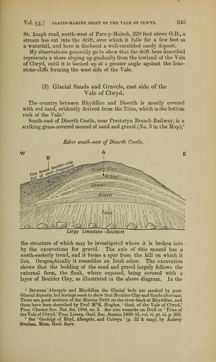 | Keywords: The Quarterly journal of the Geological Society of London (12893572175).jpg  Vol 53- GLACIO-MARINE DRIFT OF THE YALE OF CLWYD <br> 345 <br> St Asaph road north-west of Parc-y-Meirch 220 feet above O D a <br> stream has cut into the drift over which it falls for a few feet as <br> a waterfall and here is disclosed a well-stratified sandy deposit <br> My observations generally go to show that the drift here described <br> represents a shore sloping up gradually from the lowland of the Vale <br> of Clwyd until it is backed up at a greater angle against the lime- <br> stone-cliffs forming the west side of the Vale <br> 2 Glacial Sands and Gravels east side of the <br> Vale of Clwyd <br> The country between Rhyddlan and Diserth is mostly covered <br> with red sand evidently derived from the Trias which is the bottom <br> rock of the Vale 1 <br> South-east of Diserth Castle near Prestatyn Branch Eailway is a <br> striking grass-covered mound of sand and gravel No 5 in the Map ' 2 <br> W <br> Esker south-east of Diserth Castle <br> A <br> I bou <br> bro <br> Large Limestone -Boulders <br> the structure of which may be investigated where it is broken into <br> by the excavations for gravel The axis of this mound has a <br> north-easterly trend and it forms a spur from the hill on which it <br> lies Orographically it resembles an Irish esker The excavation <br> shows that the bedding of the sand and gravel largely follows the <br> external form the flank where exposed being covered with a <br> layer of Boulder Clay as illustrated in the above diagram In the <br> 1 Between Abergele and Rhyddlan the Glacial beds are masked by post- <br> Glacial deposits but borings seem to show that Boulder Clay and Sands alternate <br> There are good sections of the Marine Drift on the river-bank at R-hyddlan and <br> these have been described by Prof M C K Hughes ' Geol of the Vale of Clwyd ' <br> Proc Chester Soc Nat Sci 1884 no 3 See also remarks on Drift in ' Trias of <br> the Yale of Clwyd ' Proc Liverp Geol Soc Session 1890-91 vol vi pt iii p 285 <br> 2 See ' Geology of Rhyl Abergele and Colwyn ' p 32 map by Aubrey <br> Strahan Mem Geol Surv 36029150 111130 51125 Page 345 Text 53 http //www biodiversitylibrary org/page/36029150 1897 Geological Society of London Biodiversity Heritage Library The Quarterly journal of the Geological Society of London v 53 1897 Geology Periodicals Smithsonian Libraries bhl page 36029150 dc identifier http //biodiversitylibrary org/page/36029150 smithsonian libraries Information field Flickr posted date ISOdate 2014-03-03 Check categories 2015 August 26 CC-BY-2 0 BioDivLibrary https //flickr com/photos/61021753 N02/12893572175 2015-08-26 17 51 28 cc-by-2 0 PD-old-70-1923 The Quarterly journal of the Geological Society of London 1897 Photos uploaded from Flickr by Fæ using a script |