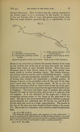 | Keywords: The Quarterly journal of the Geological Society of London (12893440423).jpg Vol 53- <br> THE SUMMIT OF THE ET7RKA PASS <br> 17 <br> Jurassic limestones Thus I believe that the opinion expressed in <br> my former paper as to a recurrence of the marble is correct <br> I was not however able to trace this second mass farther west <br> The very rough diagram appended fig 1 a reproduction of one <br> 1 Jurassic <br> 2 Probably crushed marble <br> 3 Small patch probably crushed <br> marble <br> Quite typical Jurassic 12 to <br> 15 feet exposed <br> Marble end of crag by road <br> Road <br> Intervening spaces mostly turf-covered Bock if any visible Jurassic <br> -drawn in my note-book to indicate the general relation of the rocks <br> on the western side of the top of the pass may make the matter <br> clearer than copies of more detailed sections Next comes more <br> limestone grey or dark blue in colour in one place having some <br> sandy bands in another becoming clayey The details however <br> are without interest and the rock is undoubtedly Jurassic Lastly <br> we found a pale-grey porphyritic gneissoid rock with indications <br> of having been crushed ; not improbably a modified granite It <br> belongs however to the crystalline series of this part of the Alps <br> and is much older than the Jurassic period So far as one can <br> judge the succession which we observe close to the top of the pass 1 <br> continues towards the west except that the upper bed of marble seems <br> to disappear The lower and larger mass is masked after passing <br> beneath the road by turf and talus and so far as I could see does <br> not reappear It is not indicated on the maps and I think no <br> conspicuous outcrop occurs on the slopes of the glen west of the <br> pass 2 The dip of the above-mentioned rocks is variable in amount <br> and in direction but something like 45° for the one and W N W <br> for the other may serve as a rough approximation The marble at <br> the top of the pass was more steeply inclined having a dip nearer <br> 70° ; this so far as I remember was however rather exceptionally <br> high <br> 1 Op cit p 295 cf fig 3 <br> 2 The slopes are steep and grassy and exposures of rock mostly small I <br> found at one place about 1400 feet above the Ehone Glacier Hotel a very small <br> outcrop which might possibly represent the marble in a greatly crushed condition <br> But in this part I have not attempted to make a minute examination <br> Q J G S No 209 c 36028722 111130 51125 Page 17 Text 53 http //www biodiversitylibrary org/page/36028722 1897 Geological Society of London Biodiversity Heritage Library The Quarterly journal of the Geological Society of London v 53 1897 Geology Periodicals Smithsonian Libraries bhl page 36028722 dc identifier http //biodiversitylibrary org/page/36028722 smithsonian libraries Information field Flickr posted date ISOdate 2014-03-03 Check categories 2015 August 26 CC-BY-2 0 BioDivLibrary https //flickr com/photos/61021753 N02/12893440423 2015-08-26 17 52 50 cc-by-2 0 PD-old-70-1923 The Quarterly journal of the Geological Society of London 1897 Photos uploaded from Flickr by Fæ using a script |
