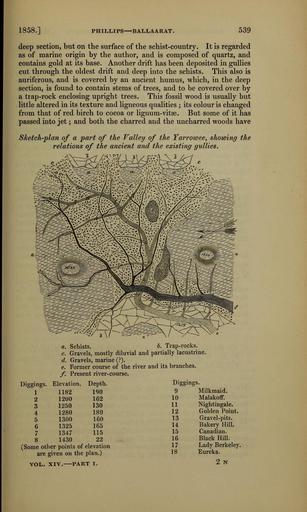| Keywords: The Quarterly journal of the Geological Society of London (12826373655).jpg 1858 <br> PHILLIPS BALLAARAT <br> 539 <br> deep section but on the surface of the schist-country It is regarded <br> as of marine origin by the author and is composed of quartz and <br> contains gold at its base Another drift has been deposited in gullies <br> cut through the oldest drift and deep into the schists This also is <br> auriferous and is covered by an ancient humus which in the deep <br> section is found to contain stems of trees and to be covered over by <br> a trap-rock enclosing upright trees This fossil wood is usually but <br> little altered in its texture and ligneous qualities ; its colour is changed <br> from that of red birch to cocoa or lignum-vitse But some of it has <br> passed into jet ; and both the charred and the uncharred woods have <br> Sketch-plan of a part of the Valley of the Tarrowee showing the <br> relations of the ancient and the existing gullies <br> c <br> d <br> e <br> / ˘ <br> Diggings Elevation Depth <br> 1 1182 190 <br> 2 1200 162 <br> 3 1250 130 <br> 4 1280 180 <br> 5 1300 160 <br> 6 1325 165 <br> 7 1347 115 <br> 8 1430 22 <br> Some other points of elevation <br> are given on the plan <br> VOL XIV PART I <br> Schists b Trap-rocks <br> Gravels mostly diluvial and partially lacustrine <br> Gravels marine <br> Former course of the river and its branches <br> Present river- course <br> Diggings <br> 9 <br> Milkmaid <br> 10 <br> Malakoff <br> 11 <br> Nightingale <br> 12 <br> Golden Point <br> 13 <br> Gravel-pits <br> 14 <br> Bakery Hill <br> 15 <br> Canadian <br> 16 <br> Black Hill <br> 17 <br> Lady Berkeley <br> 18 <br> Eureka <br> 2 N 36214529 111684 51125 Page 539 Text v 14 http //www biodiversitylibrary org/page/36214529 1858 Geological Society of London Biodiversity Heritage Library The Quarterly journal of the Geological Society of London v 14 1858 Geology Periodicals Smithsonian Libraries bhl page 36214529 dc identifier http //biodiversitylibrary org/page/36214529 smithsonian libraries Information field Flickr posted date ISOdate 2014-02-28 Check categories 2015 August 26 CC-BY-2 0 BioDivLibrary https //flickr com/photos/61021753 N02/12826373655 2015-08-26 17 54 46 cc-by-2 0 PD-old-70-1923 The Quarterly journal of the Geological Society of London 1858 Photos uploaded from Flickr by Fæ using a script |