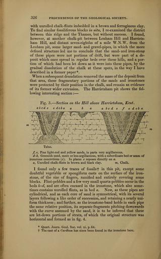 | Keywords: The Quarterly journal of the Geological Society of London (12826412333).jpg  326 <br> PROCEEDINGS OF THE GEOLOGICAL SOCIETY <br> with unrolled chalk-flints imbedded in a brown and ferruginous clay <br> To find similar fossiliferous blocks in situ I re-examined the district <br> between this ridge and the Thames but without success I found <br> however at another chalk-pit between Lenham Hill and Harriets- <br> ham Hill and distant seven-eighths of a mile W N W from the <br> Lenham pit some larger sand- and gravel-pipes in which the more <br> defined structure led me to conclude that the sand- and iron-stone <br> of these pipes were not portions of drift but were part of a de- <br> posit which once spread in regular beds over these hills and a por- <br> tion of which had been let down as it were into these pipes by the <br> gradual dissolution of the chalk at these spots in the way I have <br> described in a former paper <br> When a subsequent denudation removed the mass of the deposit from <br> that area these fragmentary portions of the sands and ironstones <br> were protected by their position in the chalk and remain as evidence <br> of its former wider extension The Harrietsham pit shows the fol- <br> lowing interesting section ” <br> Fig 3 ” Section on the Hill above Harrietsham Kent <br> abode edcba a b a a bed e f e deba <br> x7 I – Â» \ r v 7 <br> X ' r Km ' <br> Talus <br> f e Fine light-red and yellow sands in parts very argillaceous <br> d-b Greenish sand more or less argillaceous with a subordinate bed or seam of <br> ironstone concretions e In places c reposes directly on a <br> a Unrolled chalk-flints in brown and black clay m Chalk <br> I found only a few traces of fossils f in this pit except some <br> doubtful vegetable or spongiform casts on the surface of the iron- <br> stone of the size of fingers ramified and entirely covering some <br> blocks Flint-pebbles and a few very small quartz-pebbles occur in the <br> beds b-d and are often encased in the ironstone which also some- <br> times contains unrolled flints as in bed a Now as these pipes are <br> cylindrical and as each core of sand is symmetrical with its several <br> layers following a like order of succession and retaining a nearly uni- <br> form thickness ; and further as the ironstone-band holds in each pipe <br> the same relative position its separate fragments pitching downwards <br> with the curve assumed by the sand it is to be inferred that these <br> are let-down portions of strata of which the original structure was <br> horizontal and formed as in fig 4 <br> Quart Journ Geol Soc vol xi p 64 <br> f The cast of a Cardium has since been found in the ironstone here 36214300 111684 51125 Page 326 Text v 14 http //www biodiversitylibrary org/page/36214300 1858 Geological Society of London NameFound Cardium NameConfirmed Cardium EOLID 50301 NameBankID 2693257 Biodiversity Heritage Library The Quarterly journal of the Geological Society of London v 14 1858 Geology Periodicals Smithsonian Libraries bhl page 36214300 dc identifier http //biodiversitylibrary org/page/36214300 smithsonian libraries Information field Flickr posted date ISOdate 2014-02-28 Check categories 2015 August 26 CC-BY-2 0 BioDivLibrary https //flickr com/photos/61021753 N02/12826412333 2015-08-26 17 52 36 cc-by-2 0 PD-old-70-1923 The Quarterly journal of the Geological Society of London 1858 Photos uploaded from Flickr by Fæ using a script |