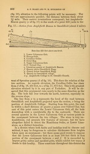 | Keywords: The Quarterly journal of the Geological Society of London (12736009735).jpg 356 <br> J F BLAKE AND W H H1JDLEST0N ON <br> fig 16 attention to the following points will be necessary The <br> two are approximately parallel ; the distance between them about <br> 1 J mile Their eastern terminations correspond ; but Ampleforth- <br> Beacon quarry e of fig 17 is due south of a point 300 yards to the <br> Fig 17 ” Section from Ampleforth Beacon to Oswaldkirlc about 2 miles <br> w <br> 675 ft <br> ac v;vvvx ; <br> Base-line 225 feet above sea-level <br> 1 Lower Calcareous Grit <br> 2' Passage beds <br> 4 Coralline Oolite <br> 4\ Coral Rag <br> 5 Upper Calcareous Grit <br> O C Oxford Clay <br> e Limestone quarry at Ampleforth Beacon <br> f Quarry above Oswaldkirk Hagg <br> g Quarry below Oswaldkirk Hagg <br> h Quarry in Oswaldkirk village <br> x-y Ampleforth College to St Oswald's Church <br> West of Sproxton quarry cl of fig 16 This fixes the relation of the <br> two sections As regards elevation the Coralline Oolite has risen <br> from d of fig 16 450 feet to e of fig 17 675 feet This is the greatest <br> elevation attained by it in any part of Yorkshire It will be ob- <br> served that this escarpment runs nearly in the same direction as the <br> dip The beds fall over towards the north however especially on <br> the reverse slope <br> The line from x to y represents the level of the road between <br> Oswaldkirk and Ampleforth projected upon the section x being the <br> position of Ampleforth College Starting from this point the road <br> to within a short distance of quarry g passes over Oxford Clay but <br> east of this point enters the Lower Calcareous Grit all the beds <br> descending with a considerable dip to the eastwards There are <br> several quarries in the Lower Calcareous Grit at various points in <br> the escarpment between the two villages The stone is very un- <br> tbssiliferous and presents few features of interest; but we have <br> altogether failed to detect the Hambleton Oolite or Lower Lime- <br> stone as a distinct formation <br> In a district where both faults and landslips tend to obscure and <br> mislead it may be dangerous to calculate thicknesses from heights <br> taken upon an escarpment ; but there seems good reason to suppose <br> that the Lower Calcareous Grit is at least 100 feet thick in that <br> portion of the escarpment between e and / It is succeeded by <br> impure gritty oolites and speckled grits which exhibit few traces of <br> fossils in this locality These constitute throughout this district the 35818485 110705 51125 Page 356 Text 33 http //www biodiversitylibrary org/page/35818485 1877 Geological Society of London Biodiversity Heritage Library The Quarterly journal of the Geological Society of London v 33 1877 Geology Periodicals Smithsonian Libraries bhl page 35818485 dc identifier http //biodiversitylibrary org/page/35818485 smithsonian libraries Information field Flickr posted date ISOdate 2014-02-24 Check categories 2015 August 26 CC-BY-2 0 BioDivLibrary https //flickr com/photos/61021753 N02/12736009735 2015-08-26 20 00 49 cc-by-2 0 PD-old-70-1923 The Quarterly journal of the Geological Society of London 1877 Photos uploaded from Flickr by Fæ using a script |