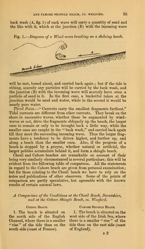 | Keywords: The Quarterly journal of the Geological Society of London (12736062034).jpg AND CAHORE SHINGLE BEACH CO WEXFORD <br> 35 <br> back wash A fig 1 of each wave will carry a quantity of sand and <br> the like with it which at the junction B with the incoming wave <br> Fig 1 ” Diagram of a Wind-wave breaking on a shelving beach <br> will be met tossed about and carried back again ; but if the tide is <br> ebbing scarcely any particles will be carried by the back wash and <br> the junction B with the incoming wave will scarcely have even a <br> particle of sand in it In the first case a bucketful taken at the <br> junction would be sand and water while in the second it would bo <br> nearly pure water <br> Third Point ” Currents carry the smallest fragments furthest <br> Tidal currents are different from other currents They break on the <br> shore in successive waves whether these be augmented by wind- <br> waves or not drive the fragments obliquely up the beach the larger <br> ones to remain or only to be brought back a little way while the <br> smaller ones are caught in the back wash and carried back again <br> till they meet the succeeding incoming wave Thus the larger frag- <br> ments have a tendency to be driven higher and further up and <br> along a beach than the smaller ones Also if the progress of a <br> beach is stopped by a groyne whether natural or artificial the <br> larger pebbles accumulate behind it and form a shingle beach <br> Chesil and Cahore beaches are remarkable on account of their <br> being very similarly circumstanced in several particulars; this will be <br> evident from the following table of comparison All the statements <br> in regard to the Cahore beach are given from personal examination ; <br> but for those relating to the Chesil beach we have to rely on the <br> notes and publications of other observers Some of the points of <br> comparison are partly speculative but agreeable with the known <br> results of certain natural laws <br> A Comparison of the Conditions at the Chesil Beach Dorsetshire <br> and at the Cahore Shingle Beach co Wexford <br> Chesil Beach <br> 1 The beach is situated on <br> the north side of the English <br> Channel where there is a smaller <br> rise 1 ' of the tide than on the <br> south side coast of France <br> Cahore Shingle Beach <br> 1 The beach is situated on the <br> west side of the Irish Sea where <br> there is a smaller rise of the <br> tide than on the east side coast <br> of England <br> d2 35818088 110705 51125 Page 35 Text 33 http //www biodiversitylibrary org/page/35818088 1877 Geological Society of London Biodiversity Heritage Library The Quarterly journal of the Geological Society of London v 33 1877 Geology Periodicals Smithsonian Libraries bhl page 35818088 dc identifier http //biodiversitylibrary org/page/35818088 smithsonian libraries Information field Flickr posted date ISOdate 2014-02-24 Check categories 2015 August 26 CC-BY-2 0 BioDivLibrary https //flickr com/photos/61021753 N02/12736062034 2015-08-26 19 51 50 cc-by-2 0 PD-old-70-1923 The Quarterly journal of the Geological Society of London 1877 Photos uploaded from Flickr by Fæ using a script |