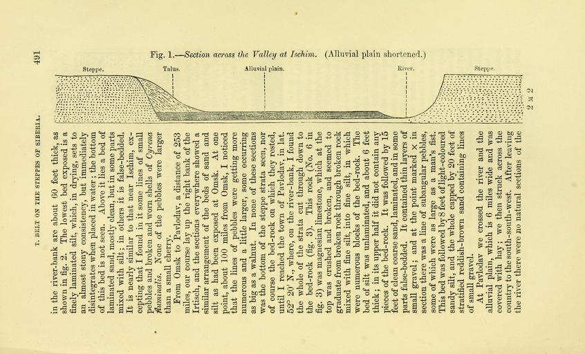 | Keywords: The Quarterly journal of the Geological Society of London (12733920315).jpg  492 <br> T BELT ON THE STEPPES OF SIBERIA <br> Fig 2  Section of <br> Strata at Omsk <br> Fig 3  Section of Strata at Pavlodav <br> 1 1 foot surface-soil <br> 2 20 feet stratified red- <br> dish-brown sand with <br> lines of small gravel <br> 3 8 feet light - coloured <br> sandy silt <br> 4 15 feet coarse clean <br> sand with lines of <br> small pebbles and <br> one line of coarser <br> pebbles at X ˘ <br> 5 6 feet clayey unlami- <br> nated silt with frag- <br> ments of bed-rock in <br> lower half <br> 6 Magnesian limestone <br> much crashed and <br> broken at top <br> strata exposed; but 20 miles south of Pavlodav I noticed that the <br> surface soil contained many small subangular pebbles ; and having <br> already determined that the sand and pebbles had come from the <br> south towards which I was travelling I was on the look-out for <br> larger stones The country was now of a more undulating character <br> and there were many shallow salt lakes When 60 miles from <br> Pavlodav in the middle of the night the wheel of the tarantass for the <br> first time in a journey of nearly 1000 miles jolted over a stone ; and <br> on getting out I found there were many angular pieces of quartz <br> lying en the surface from 3 to 4 inches in diameter <br> After this the stones increased in number and size ; and 20 miles <br> further south the surface-soil was full of large angular boulders of <br> quartz some of which were 8 feet across Many large tabular <br> masses of quartz rock looked as if in situ ; but several of them bad <br> been quarried to build the enclosures of the government station and <br> they were seen to have rested in and on a sandy clay containing <br> few other stones There was nothing about these boulders or the <br> clay in which they rested to suggest that they were moraine accu- <br> mulations ; they were distributed over a nearly level plain as if they <br> had been dropped from floating ice <br> Beyond this point southwards the bed-rock often comes to the <br> surface in ridges and low hills of highly metamorphosed crystalline <br> rocks separated by level plains composed of a sandy clay with <br> numerous small angular stones invariably of the rocks seen in situ 35766413 110599 51125 Page 491 Text v 30 http //www biodiversitylibrary org/page/35766413 1874 Geological Society of London Biodiversity Heritage Library The Quarterly journal of the Geological Society of London v 30 1874 Geology Periodicals Smithsonian Libraries bhl page 35766413 dc identifier http //biodiversitylibrary org/page/35766413 smithsonian libraries Information field Flickr posted date ISOdate 2014-02-24 Check categories 2015 August 26 CC-BY-2 0 BioDivLibrary https //flickr com/photos/61021753 N02/12733920315 2015-08-26 19 55 14 cc-by-2 0 PD-old-70-1923 The Quarterly journal of the Geological Society of London 1874 Photos uploaded from Flickr by FĂŚ using a script |