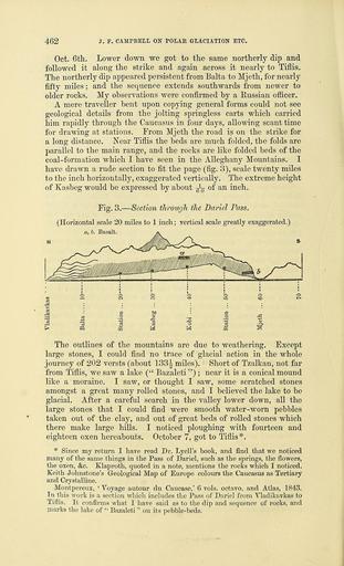 | Keywords: The Quarterly journal of the Geological Society of London (12734076603).jpg J F CAMPBELL ON POLAK GLACIATION ETC 463 <br> 23 Daghestan the mountain-country is on the north side at <br> the Caspian end of the Caucasus The rocks are chiefly the folded <br> limestones which we crossed in the pass of Dariel afterwards and <br> apparently some of the dark shales on which they rest unconform- <br> ably The limestones are very like beds which appear in the right <br> bank of the Volga The long folds are parallel to the main range <br> One bed of dark earthy shale contains large globular concre- <br> tions We come to it repeatedly in Daghestan in deep water- <br> courses Another bed consists of large hard rolled pebhles in a <br> matrix <br> From the nature of the country the clearness of the air and the <br> absence of vegetation the structure of Daghestan is easily seen <br> The edges of the flags and schists and igneous rocks which we after- <br> wards passed near Kasbeg seem to form the crests of the whole <br> range and furnish the boulders and pebbles which the largest rivers <br> roll down to the plains <br> 24 West-end From Tiflis to Poti on the south side of the <br> range and along the shores of the Black Sea the structure seen <br> near Tiflis appears to extend into the Crimea along the northern <br> shores of the Black Sea <br> The lower hills are made of folded beds of newer stratified rocks <br> the higher hills of the edges of harder beds upheaved I will not <br> attempt to guess at the age of the rocks ; but some appeared like <br> Mountain-Limestones the Coal-measures and superincumbent strata <br> Coal has been found in the Caucasus and is worked north of the Sea <br> of Azov and south of the Black Sea <br> In any case a great thickness of old sedimentary beds have been <br> tilted up on edge and a great thickness of newer beds have been <br> crumpled and folded like dough ; and the key to Southern-Bussian <br> geology is in the Caucasus in the Gate of Asia in the pass of <br> Dariel The general disturbance may be found to coincide with the <br> geological disturbance which upheaved the Alps and other chains <br> Between lat 30° and 40° N there is a marvellous coincidence in the <br> general direction of mountain-ranges in Europe and Asia <br> 25 Denudation Such is a rude outline of the geology which I <br> thought I saw while rapidly travelling through the Caucasus The <br> shapes of the hills and hollows which I studied and drew clearly <br> are due to aqueous denudation see fig 4 <br> If ever glaciers worked in the range their traces have been <br> almost entirely obliterated Very little rain now falls in Daghestan <br> or anywhere on the northern slopes The rivers which drain the <br> range are small Houses have flat roofs ; dresses are not contrived <br> In the map Daghestan which was conquered about eight years ago is not <br> coloured <br> Koch's Geological Map 1850 does not colour Daghestan The Dariel Pass <br> from north to south is coloured Tertiares Secondares Gestein and Thon- <br> Schiefer Kasbeg and the opposite mountain are coloured Volcanic including <br> therein Basalt and Trachyte <br> I have also read Mr Freshfield's book and his paper published by the Geo- <br> graphical Society to which I refer below 35766384 110599 51125 Page 462 Text v 30 http //www biodiversitylibrary org/page/35766384 1874 Geological Society of London NameFound Poti NameConfirmed Poti EOLID 4257004 NameBankID 4576268 Biodiversity Heritage Library The Quarterly journal of the Geological Society of London v 30 1874 Geology Periodicals Smithsonian Libraries bhl page 35766384 dc identifier http //biodiversitylibrary org/page/35766384 smithsonian libraries Information field Flickr posted date ISOdate 2014-02-24 Check categories 2015 August 26 CC-BY-2 0 BioDivLibrary https //flickr com/photos/61021753 N02/12734076603 2015-08-26 20 02 19 cc-by-2 0 PD-old-70-1923 The Quarterly journal of the Geological Society of London 1874 Photos uploaded from Flickr by Fæ using a script |