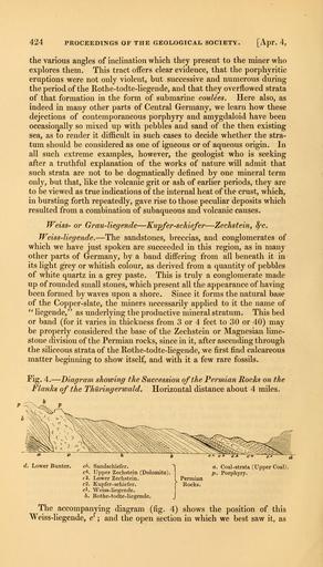 | Keywords: The Quarterly journal of the Geological Society of London (12711710663).jpg 424 <br> PROCEEDINGS OF THE GEOLOGICAL SOCIETY Apr 4 <br> the various angles of inclination which they present to the miner who <br> explores them This tract oifers clear evidence that the porphyritic <br> eruptions were not only violent but successive and numerous during <br> the period of the Rothe-todte-liegende and that they overflowed strata <br> of that formation in the form of submarine coulees Here also as <br> indeed in many other parts of Central Germany we learn how these <br> dejections of contemporaneous porphyry and amygdaloid have been <br> occasionally so mixed up with pebbles and sand of the then existing <br> sea as to render it difficult in such cases to decide whether the stra- <br> tum should be considered as one of igneous or of aqueous origin In <br> all such extreme examples however the geologist who is seeking <br> after a truthful explanation of the works of nature will admit that <br> such strata are not to be dogmatically defined by one mineral term <br> only but that like the volcanic grit or ash of earlier periods they are <br> to be viewed as true indications of the internal heat of the crust which <br> in bursting forth repeatedly gave rise to those peculiar deposits which <br> resulted from a combination of subaqueous and volcanic causes <br> Weiss- or Grau-liegende Kupfer-schiefer Zechstein c <br> Weiss-liegende The sandstones breccias and conglomerates of <br> which we have just spoken are succeeded in this region as in many <br> other parts of Germany by a band differing from all beneath it in <br> its light grey or whitish colour as derived from a quantity of pebbles <br> of white quartz in a grey paste This is truly a conglomerate made <br> up of rounded small stones which present all the appearance of having <br> been formed by waves upon a shore Since it forms the natural base <br> of the Copper-slate the miners necessarily applied to it the name of <br> ' liegende as underlying the productive mineral stratum This bed <br> or band for it varies in thickness from 3 or 4 feet to 30 or 40 may <br> be properly considered the base of the Zechstein or Magnesian lime- <br> stone division of the Permian rocks since in it after ascending through <br> the siliceous strata of the Rothe-todte-liegende we first find calcareous <br> matter beginning to show itself and with it a few rare fossils <br> Fig 4 Diagram showing the Succession of the Fermian Rocks on the <br> Flanks of the Thuringerwald Horizontal distance about 4 miles <br> d Lower Bunter eS Sandschiefer <br> c4 Upper Zechstein Dolomite <br> / 3 Lower Zechstein Permian <br> c2 Kupfer-schiefer j Rocks <br> cl Weiss-liegende <br> b Rothe-todte-liegende J <br> a Coal-strata Upper Coal <br> p Porphyry <br> The accompanying diagram fig 4 shows the position of this <br> Weiss-liegende c ; and the open section in which we best saw it as 35615012 110213 51125 Page 424 Text v 11 http //www biodiversitylibrary org/page/35615012 1855 Geological Society of London Biodiversity Heritage Library The Quarterly journal of the Geological Society of London v 11 1855 Geology Periodicals Smithsonian Libraries bhl page 35615012 dc identifier http //biodiversitylibrary org/page/35615012 smithsonian libraries Information field Flickr posted date ISOdate 2014-02-23 Check categories 2015 August 26 CC-BY-2 0 BioDivLibrary https //flickr com/photos/61021753 N02/12711710663 2015-08-26 20 58 15 cc-by-2 0 PD-old-70-1923 The Quarterly journal of the Geological Society of London 1855 Photos uploaded from Flickr by FĂŚ using a script |