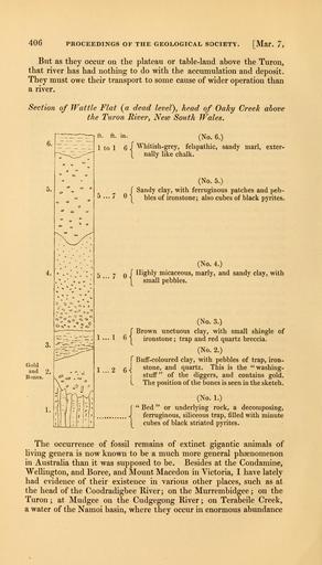 Keywords: The Quarterly journal of the Geological Society of London (12711529125).jpg 406 <br> PROCEEDINGS OF THE GEOLOGICAL SOCIETY Mar 7 <br> But as they occur on the plateau or table-land above the Turon <br> that river has had nothing to do with the accumulation and deposit <br> They must owe their transport to some cause of wider operation than <br> a river <br> Section of Wattle Flat a dead level head of Oaky Creek above <br> the Turon River New South Wales <br> Gold <br> and 2 <br> Bones <br> ft ft in No 6 <br> 1 to 1 \ Whitish-grey felspathic sandy marl exter- <br> nally like chalk <br> No 5 <br> Sandy clay with ferruginous patches and peb- <br> bles of ironstone; also cubes of black pyrites <br> No 4 <br> - Q J Highly micaceous marly and sandy clay with <br> 1 small pebbles <br> No 3 <br> Brown unctuous clay with small shingle of <br> ironstone ; trap and red quartz breccia <br> No 2 <br> r Buflf-coloured clay with pebbles of trap iron- <br> g J stone and quartz This is the washing- <br> I stuff of the diggers and contains gold <br> I The position of the bones is seen in the sketch <br> No 1 <br> Bed or underlying rock a decomposing <br> ferruginous siliceous trap filled with minute <br> cubes of black striated pyrites <br> The occurrence of fossil remains of extinct gigantic animals of <br> living genera is now known to be a much more general phsenomenon <br> in Australia than it was supposed to be Besides at the Condamine <br> Wellington and Boree and Mount Macedon in Victoria I have lately <br> had evidence of their existence in various other places such as at <br> the head of the Coodradigbee River ; on the Murrembidgee ; on the <br> Turon ; at Mudgee on the Cudgegong River ; on Terabeile Creek <br> a water of the Namoi basin where they occur in enormous abundance 35614994 110213 51125 Page 406 Text v 11 http //www biodiversitylibrary org/page/35614994 1855 Geological Society of London Biodiversity Heritage Library The Quarterly journal of the Geological Society of London v 11 1855 Geology Periodicals Smithsonian Libraries bhl page 35614994 dc identifier http //biodiversitylibrary org/page/35614994 smithsonian libraries Information field Flickr posted date ISOdate 2014-02-23 Check categories 2015 August 26 CC-BY-2 0 BioDivLibrary https //flickr com/photos/61021753 N02/12711529125 2015-08-26 21 01 32 cc-by-2 0 PD-old-70-1923 The Quarterly journal of the Geological Society of London 1855 Photos uploaded from Flickr by Fæ using a script |