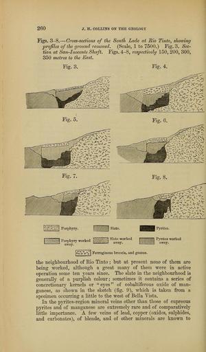| Keywords: The Quarterly journal of the Geological Society of London (13889827040).jpg 260 <br> J H COLLIN'S OZI THE GEOLOGY <br> Figs 3-8 Cross-sections of the South Lode at Bio Tinto showing <br> profiles of the ground removed Scale 1 to 7500 Pig 3 Sec- <br> tion at San-Inocente Shaft Figs 4-8 respectively 150 200 300 <br> 350 metres to the East <br> Fig 3 <br> Fi- 4 <br> FiR 5 <br> Fi2 6 <br> Porphyry <br> Slate <br> Pyrites <br> p p Porphyry worked <br> - ˘--- ' away <br> Slate worted <br> away <br> Permginoxis breccia and gozzan <br> Pyntes worked <br> a way <br> the neiglibonrliood of Eio Tinto ; but at present none of them are <br> being worked although a great many of them were in active <br> operation some ten j ears since The slate in the neighbourhood is <br> generally of a purplish colour; sometimes it contains a series of <br> concretionary kernels or eyes of cobaltiferous oxide of man- <br> ganese as shown in the sketch fig 9 which is taken from a <br> specimen occurring a little to the west of Bella Yista <br> In the pyrites-region mineral veins other than those of cupreous <br> pyrites and of manganese are extremely rare and of comparatively <br> little importance A few veins of lead copper oxides sulphides <br> and carbonates of blende and of other minerals are known to 37047116 114009 51125 Page 260 Text 41 http //www biodiversitylibrary org/page/37047116 1885 Geological Society of London NameFound Permginoxis breccia Biodiversity Heritage Library The Quarterly journal of the Geological Society of London v 41 1885 Geology Periodicals Smithsonian Libraries bhl page 37047116 dc identifier http //biodiversitylibrary org/page/37047116 smithsonian libraries Information field Flickr posted date ISOdate 2014-04-30 Check categories 2015 August 26 CC-BY-2 0 BioDivLibrary https //flickr com/photos/61021753 N02/13889827040 2015-08-26 04 56 08 cc-by-2 0 PD-old-70-1923 The Quarterly journal of the Geological Society of London 1885 Photos uploaded from Flickr by FĂŚ using a script |