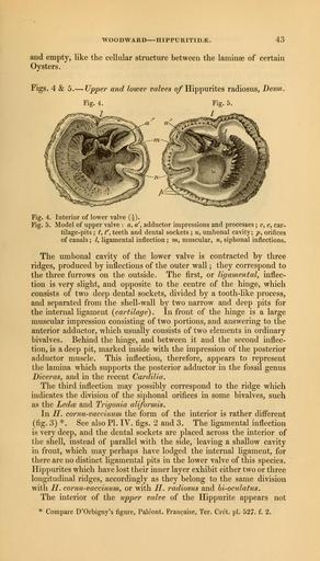 | Keywords: The Quarterly journal of the Geological Society of London (12711766224).jpg WOODWARD HIPPURITIDiE <br> 43 <br> and empty like the cellular structure between the laminae of certain <br> Oysters <br> Figs 4 5 ” Upper and lower valves q/ Hippurites radiosus Desm <br> Fig 4 <br> Fig 5 <br> Fig <br> Fig <br> 4 Interior of lower valve <br> 5 Model of upper valve a a' adductor impressions and processes ; c c car- <br> tilage-pits ; t f teeth and dental sockets ; u umbonal cavity; p orifices <br> of canals ; I ligamental inflection ; m muscular n siphonal inflections <br> The umbonal cavity of the lower valve is contracted by three <br> ridges produced by inflections of the outer wall ; they correspond to <br> the three furrows on the outside The first or ligamental inflec- <br> tion is very slight and opposite to the centre of the hinge which <br> consists of two deep dental sockets divided by a tooth-like process <br> and separated from the shell-wall by two narrow and deep pits for <br> the internal ligament cartilage In front of the hinge is a large <br> muscular impression consisting of two portions and answering to the <br> anterior adductor which usually consists of two elements in ordinary <br> bivalves Behind the hinge and between it and the second inflec- <br> tion is a deep pit marked inside with the impression of the posterior <br> adductor muscle This inflection therefore appears to represent <br> the lamina which supports the posterior adductor in the fossil genus <br> Dicer as and in the recent Cardilia <br> The third inflection may possibly correspond to the ridge which <br> indicates the division of the siphonal orifices in some bivalves such <br> as the LedcE and Trigonia aliformis <br> In H cornu-vaccinum the form of the interior is rather diff'erent <br> fig 3 See also PI IV figs 2 and 3 The ligamental inflection <br> is very deep and the dental sockets are placed across the interior of <br> the shell instead of parallel with the side leaving a shallow cavity <br> in front which may perhaps have lodged the internal ligament for <br> there are no distinct ligamental pits in the lower valve of this species <br> Hippurites which have lost their inner layer exhibit either two or three <br> longitudinal ridges accordingly as they belong to the same division <br> with H cornu-vaccinum or with H radiosus and bi-oculatus <br> The interior of the upper valve of the Hippurite appears not <br> Compare D'Orbigny's figure Paleont Fran aise Ter Cret pi 527 f 2 35614603 110213 51125 Page 43 Text v 11 http //www biodiversitylibrary org/page/35614603 1855 Geological Society of London NameFound Cardilia NameConfirmed Cardilia EOLID 4771581 NameBankID 4103708 NameFound H cornu-vaccinum NameFound Hippurites NameConfirmed Hippurites EOLID 4773611 NameBankID 4195877 NameFound Hippurites radiosus NameConfirmed Hippurites radiosus NameBankID 6868549 NameFound Trigonia aliformis Biodiversity Heritage Library The Quarterly journal of the Geological Society of London v 11 1855 Geology Periodicals Smithsonian Libraries bhl page 35614603 dc identifier http //biodiversitylibrary org/page/35614603 smithsonian libraries Information field Flickr posted date ISOdate 2014-02-23 Check categories 2015 August 26 CC-BY-2 0 BioDivLibrary https //flickr com/photos/61021753 N02/12711766224 2015-08-26 20 58 09 cc-by-2 0 PD-old-70-1923 The Quarterly journal of the Geological Society of London 1855 Photos uploaded from Flickr by Fæ using a script |