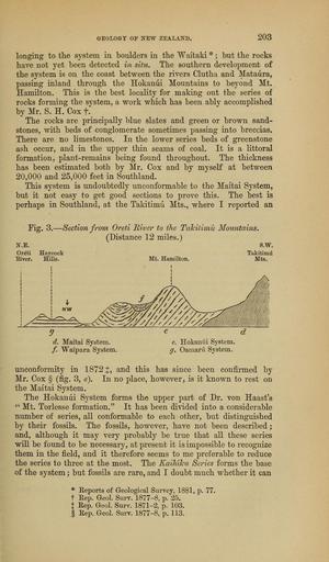 | Keywords: The Quarterly journal of the Geological Society of London (13889809658).jpg GEOLOGY OP NEW ZEALAND <br> 203 <br> longing to the system in boulders in the Waitaki ; but the rocks <br> have not yet been detected in situ The southern development of <br> the system is on the coast between the rivers Clutha and Mataura <br> passing inland through the Hokanui Mountains to beyond lit <br> Hamilton This is the best locality for making out the series of <br> rocks forming the system a work which has been ably accomplished <br> by Mr S H Cox f <br> The rocks are principally blue slates and green or brown sand- <br> stones with beds of conglomerate sometimes passing into breccias <br> There are no limestones In the lower series beds of greenstone <br> ash occur and in the upper thin seams of coal It is a littoral <br> formation plant-remains being found throughout The thickness <br> has been estimated both by Mr Cox and by myself at between <br> 20 000 and 25 000 feet in Southland <br> This system is undoubtedly unconformable to the Maitai System <br> but it not easy to get good sections to prove this The best is <br> perhaps in Southland at the Takitimu Mts where I reported an <br> Fig 3 ” Section from Oreti Eiver to the Tcikitimu Mountains <br> Distance 12 miles <br> N E s w <br> Orgti Haycock Takitimu <br> Eiver Hills Mt Hamilton Mts <br> d Maitai System <br> / Waipara System <br> e Hokanui System <br> g OamarvL System <br> unconformity in 1872 J and this has since been confirmed by <br> Mr Cox § fig 3 e In no place however is it known to rest on <br> the Maitai System <br> The Hokanui System forms the upper part of Dr von Haast's <br> Mt Torlesse formation It has been divided into a considerable <br> number of series all conformable to each other but distinguished <br> by their fossils The fossils however have not been described ; <br> and although it may very probably be true that all these series <br> will be found to be necessary at present it is impossible to recognize <br> them in the field and it therefore seems to me preferable to reduce <br> the series to three at the most The KaiMJcu Series forms the base <br> of the system ; but fossils are rare and I doubt much whether it can <br> Reports of Geological Survey 1881 p 77 <br> t Eep Geol Surv 1877-8 p 25 <br> t Eep Geol Surv 1871-2 p 103 <br> § Eep Geol Surv 1877-8 p 113 37047055 114009 51125 Page 203 Text 41 http //www biodiversitylibrary org/page/37047055 1885 Geological Society of London Biodiversity Heritage Library The Quarterly journal of the Geological Society of London v 41 1885 Geology Periodicals Smithsonian Libraries bhl page 37047055 dc identifier http //biodiversitylibrary org/page/37047055 smithsonian libraries Information field Flickr posted date ISOdate 2014-04-30 Check categories 2015 August 26 CC-BY-2 0 BioDivLibrary https //flickr com/photos/61021753 N02/13889809658 2015-08-26 04 52 05 cc-by-2 0 PD-old-70-1923 The Quarterly journal of the Geological Society of London 1885 Photos uploaded from Flickr by Fæ using a script |