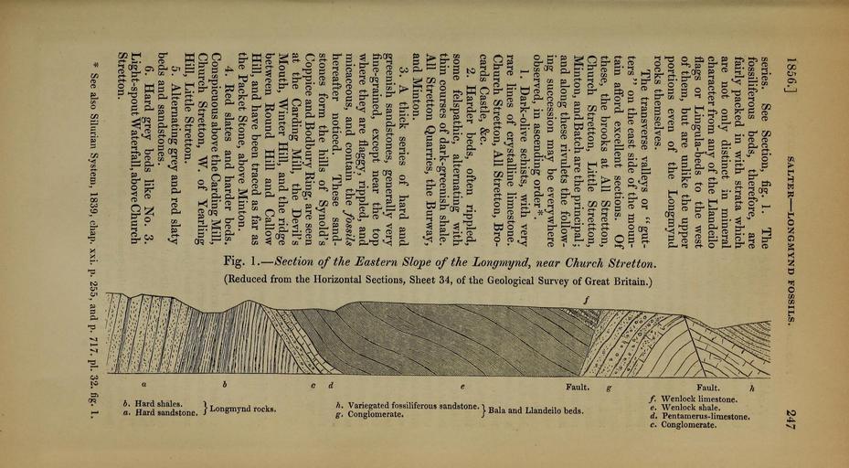 | Keywords: The Quarterly journal of the Geological Society of London (12683330003).jpg 1856 <br> SALTER LONGMYND FOSSILS <br> 247 <br> series See Section fig 1 The <br> fossiliferous beds therefore are <br> fairly packed in with strata which <br> are not only distinct in mineral <br> character from any of the Llandeilo <br> flags or Lingula-beds to the west <br> of them but are unlike the upper <br> portions even of the Longmynd <br> rocks themselves <br> The transverse valleys or gut- <br> ters on the east side of the moun- <br> tain afford excellent sections Of <br> these the brooks at All Stretton <br> Church Stretton Little Stretton <br> Minton and Batch are the principal; <br> and along these rivulets the follow- <br> ing succession may be everywhere <br> observed in ascending order <br> 1 Dark-olive schists with very <br> rare lines of crystalline limestone <br> Church Stretton All Stretton Bro- <br> cards Castle c <br> 2 Harder beds often rippled <br> some felspathic alternating with <br> thin courses of dark-greenish shale <br> All Stretton Quarries the Burway <br> and Minton <br> 3 A thick series of hard and <br> greenish sandstones generally very <br> fine-grained except near the top <br> where they are flaggy rippled and <br> micaceous and contain the fossils <br> hereafter noticed These sand- <br> stones form the hills of Synold's <br> Coppice and Bodbury Ring are seen <br> at the Carding Mill the Devil's <br> Mouth Winter Hill and the ridge <br> between Round Hill and Callow <br> Hill and have been traced as far as <br> the Packet Stone above Minton <br> 4 Red slates and harder beds <br> Conspicuous above the Carding Mill <br> Church Stretton W of Yearling <br> Hill Little Stretton <br> 5 Alternating grey and red slaty <br> beds and sandstones <br> 6 Hard grey beds like No 3 <br> Light-spout Waterfall above Church <br> Stretton <br> Qq <br> <br> sq <br> o <br> §j CO <br> / <br> C <br> « « s 9 <br> o V g S <br> pq <br> S a» <br> n3 <br> si C <br> so « <br> tJT3 <br> es ea <br> See also Silurian System 1839 chap xxi p 255 and p 717 pi 32 fig 1 35338694 109655 51125 Page 247 Text v 12 http //www biodiversitylibrary org/page/35338694 1856 Geological Society of London Biodiversity Heritage Library The Quarterly journal of the Geological Society of London v 12 1856 Geology Periodicals Smithsonian Libraries bhl page 35338694 dc identifier http //biodiversitylibrary org/page/35338694 smithsonian libraries Information field Flickr posted date ISOdate 2014-02-21 Check categories 2015 August 26 CC-BY-2 0 BioDivLibrary https //flickr com/photos/61021753 N02/12683330003 2015-08-27 11 59 17 cc-by-2 0 PD-old-70-1923 The Quarterly journal of the Geological Society of London 1856 Photos uploaded from Flickr by Fæ using a script |