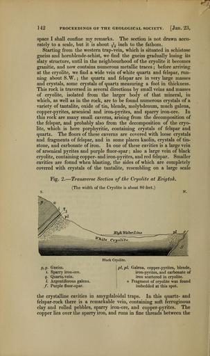 | Keywords: The Quarterly journal of the Geological Society of London (12682960265).jpg 142 <br> PROCEEDINGS OF THE GEOLOGICAL SOCIETY Jan 23 <br> space I shall confine my remarks The section is not drawn accu- <br> rately to a scale but it is about inch to the fathom <br> Starting from the western trap-vein which is situated in schistose <br> gneiss and hornblende-schist we find the gneiss gradually losing its <br> slaty structure until in the neighbourhood of the cryolite it becomes <br> granitic and now contains numerous metallic traces ; before arriving <br> at the cryolite we find a wide vein of white quartz and felspar run- <br> ning about S W ; the quartz and felspar are in very large masses <br> and crystals some crystals of quartz measuring a foot in thickness <br> This rock is traversed in several directions by small veins and masses <br> of cryolite isolated from the larger body of that mineral in <br> which as well as in the rock are to be found numerous crystals of a <br> variety of tantalite oxide of tin blende molybdenum much galena <br> copper-pyrites arsenical and iron-pyrites and sparry iron-ore In <br> this rock are many small caverns arising from the decomposition of <br> the felspar and probably also from the decomposition of the cryo- <br> lite which is here porphyritic containing crystals of felspar and <br> quartz The floors of these caverns are covered with loose crystals <br> and fragments of felspar and in some places kaolin crystals of tin- <br> stone and carbonate of iron In one of these cavities is a large vein <br> of arsenical pyrites and purple fluor-spar ; also a large vein of black <br> cryolite containing copper- and iron-pyrites and red felspar Smaller <br> cavities are found when blasting the sides of which are completely <br> covered with crystals of the tantalite resembling on a large scale <br> Fig 2 ” Transverse Section of the Cryolite at Evigtok» <br> The width of the Cryohte is about 80 feet <br> S N <br> 9 9- <br> i <br> 9- <br> I <br> / <br> Gneiss <br> Sparry iron-ore <br> Quarts-vein <br> Argentiferous galena <br> Purple fluor-spar <br> Black Cryolite <br> pi pL <br> Galena copper-pyrites blende <br> iron-pyrites and carbonate of <br> iron scattered in cryolite <br> Fragment of cryolite was found <br> imbedded at this spot <br> the crystalline cavities in amygdaloidal traps In this quartz- and <br> felspar-rock there is a remarkable vein containing soft ferruginous <br> clay and rolled pebbles sparry iron-ore and copper-pyrites The <br> copper lies over the sparry iron and runs in fine threads between the 35338579 109655 51125 Page 142 Text v 12 http //www biodiversitylibrary org/page/35338579 1856 Geological Society of London Biodiversity Heritage Library The Quarterly journal of the Geological Society of London v 12 1856 Geology Periodicals Smithsonian Libraries bhl page 35338579 dc identifier http //biodiversitylibrary org/page/35338579 smithsonian libraries Information field Flickr posted date ISOdate 2014-02-21 Check categories 2015 August 26 CC-BY-2 0 BioDivLibrary https //flickr com/photos/61021753 N02/12682960265 2015-08-27 11 53 25 cc-by-2 0 PD-old-70-1923 The Quarterly journal of the Geological Society of London 1856 Photos uploaded from Flickr by Fæ using a script |
