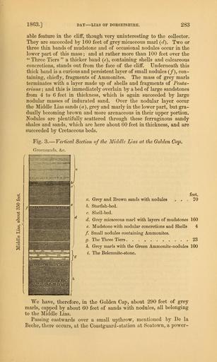 | Keywords: The Quarterly journal of the Geological Society of London (12646259584).jpg 1863 <br> DAY LIAS OF DORSETSHIRE <br> 283 <br> able feature in the cliff though very uninteresting to the collector <br> They are succeeded by 160 feet of grey micaceous marl d Two or <br> three thin bands of mudstone and of occasional nodules occur in the <br> lower part of this mass ; and at rather more than 100 feet over the <br> Three Tiers a thicker band e containing shells and calcareous <br> concretions stands out from the face of the cliff Underneath this <br> thick band is a curious and persistent layer of small nodules / con- <br> taining chiefly fragments of Ammonites The mass of grey marls <br> terminates with a layer made up of shells and fragments of Penta- <br> crinus ; and this is immediately overlain by a bed of large sandstones <br> from 4 to 6 feet in thickness which is again succeeded by large <br> nodular masses of indurated sand Over the nodular layer occur <br> the Middle Lias sands a grey and marly in the lower part but gra- <br> dually becoming brown and more arenaceous in their upper portion <br> Nodules are plentifully scattered through these ferruginous sandy <br> shales and sands which are here about 60 feet in thickness and are <br> succeeded by Cretaceous beds <br> Fig 3 ” Vertical Section of the Middle Lias at the Golden Cap <br> Greensands c <br> feet <br> a Grey and Brown sands with nodules 70 <br> b Starfish-bed <br> c Shell-bed <br> d Grey micaceous marl with layers of mudstones 160 <br> e Mudstone with nodular concretions and Shells 4 <br> / Small nodules containing Ammonites <br> g The Three Tiers 23 <br> h Grey marls with the Green Ammonite-nodules 100 <br> i The Belemnite-stone <br> We have therefore in the Golden Cap about 290 feet of grey <br> marls capped by about 60 feet of sands with nodules all belonging <br> to the Middle Lias <br> Passing eastwards over a small upthrow mentioned by De la <br> Beche there occurs at the Coastguard-station at Seatown a power- 35328248 109632 51125 Page 283 Text v 19 http //www biodiversitylibrary org/page/35328248 1863 Geological Society of London Biodiversity Heritage Library The Quarterly journal of the Geological Society of London v 19 1863 Geology Periodicals Smithsonian Libraries bhl page 35328248 dc identifier http //biodiversitylibrary org/page/35328248 smithsonian libraries Information field Flickr posted date ISOdate 2014-02-20 Check categories 2015 August 26 CC-BY-2 0 BioDivLibrary https //flickr com/photos/61021753 N02/12646259584 2015-08-27 11 51 10 cc-by-2 0 PD-old-70-1923 The Quarterly journal of the Geological Society of London 1863 Photos uploaded from Flickr by Fæ using a script |