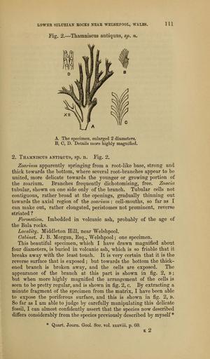 | Keywords: The Quarterly journal of the Geological Society of London (13889746329).jpg LOWER SILURIAN' ROCKS NEAR WELSHPOOL WALES <br> Fig 2 Tliainniscus antiquus Sj9 n <br> 111 <br> A The specimen enlarged 2 diameters <br> B C D Details more highly magnified <br> 2 Thamniscijs antiquus sp n Fig 2 <br> Zoarium apparently springing from a root-like base strong and <br> thick towards the bottom where several root-branches appear to be <br> united more delicate towards the younger or growing portion of <br> the zoarium Branches frequently dichotomising free Zocecia <br> tubular shown on one side only of the branch Tubular cells not <br> contiguous rather broad at the openings gradually thinning out <br> towards the axial region of the zoarium cell-mouths so far as I <br> can make out rather elongated peristomes not prominent reverse <br> striated <br> Formation Imbedded in volcanic ash probably of the age of <br> the Bala rocks <br> Locality Middleton Hill near Welshpool <br> Cahinet J B Morgan Esq Welshpool; one specimen <br> This beautiful specimen which I have drawn magnified about <br> four diameters is buried in volcanic ash which is so friable that it <br> breaks away with the least touch It is very certain that it is the <br> reverse surface that is exposed ; but towards the bottom the thick- <br> ened branch is broken away and the cells are exposed The <br> appearance of the branch at this part is shown in fig 2 b ; <br> but when more highly magnified the arrangement of the cells is <br> seen to be pretty regular and is shown in fig 2 c By extracting a <br> minute fragment of the specimen from the matrix I have been able <br> to expose the poriferous surface and this is shown in fig 2 d <br> So far as I am able to judge by carefully manipulating this delicate <br> fossil I can almost confidently assert that the species now described <br> dijffers considerably from the species previously described by myself <br> Quart Journ Greol Soc vol xxxviii p <br> k2 37046953 114009 51125 Page 111 Text 41 http //www biodiversitylibrary org/page/37046953 1885 Geological Society of London NameFound Thamniscijs antiquus sp NameConfirmed Thamniscus antiquus NameFound Tliainniscus antiquus NameFound Zoarium Biodiversity Heritage Library The Quarterly journal of the Geological Society of London v 41 1885 Geology Periodicals Smithsonian Libraries bhl page 37046953 dc identifier http //biodiversitylibrary org/page/37046953 smithsonian libraries Information field Flickr posted date ISOdate 2014-04-30 Check categories 2015 August 26 CC-BY-2 0 BioDivLibrary https //flickr com/photos/61021753 N02/13889746329 2015-08-26 04 54 41 cc-by-2 0 PD-old-70-1923 The Quarterly journal of the Geological Society of London 1885 Photos uploaded from Flickr by FĂŚ using a script |