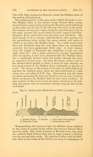 | Keywords: The Quarterly journal of the Geological Society of London (12645690655).jpg 120 <br> PROCEEDINGS OF THE GEOLOGICAL SOCIETY DeC 17 <br> Vale of St John westward to Keswick bound the Skiddaw slates of <br> this portion of Cumberland <br> The southern portion of this area rarely exhibits the rocks in situ <br> The Skiddaw slates in this district occupy Flaseow Moor a large <br> tract of barren country lying between the Keswick and Penrith lload <br> on the north and the base of the hills just referred to on the south <br> Two streams having their origin among the greenish-grey rocks on <br> the south intersect this moory district in their course to the Glen- <br> dermaken River which flows into the Greta near Threlkeld The <br> most easterly of these streams called Troutbeck after passing over <br> the greenish-grey rocks reaches the moory country and begins to <br> exhibit in its course the Skiddaw slates In a small brook which <br> flows into Troutbeck from the west these slates are considerably <br> contorted but have predominant S S E dips A short distance <br> above the hamlet of Troutbeck this inclination is well seen the <br> angle being 40°; and a gritty quartz-rock strongly impregnated <br> with iron-pyrites is here seen associated with the Skiddaw slates <br> For a considerable distance below this hamlet through the moor <br> no exposures of rock occur ; but when the stream reaches near to <br> the Keswick Road parallel to which it flows for some distance we <br> have good sections of the Skiddaw slates principally on the line of <br> strike The stream in this portion of its course is called Gills-beck <br> and here the Skiddaw slates which are thin-bedded and of a dark <br> colour have prevailing N N W dips Intercalated with the strata <br> are masses possessing the structure known as cone-in- cone a feature <br> which accompanies the Skiddaw slates in some other localities In <br> some portions of this section there are great contortions in the bed- <br> ding and quartz-veins are abundant running along the lines of the <br> contortions <br> N N W <br> Fig 3 ” Section from Matterdale to Uldale 12 miles <br> S S E <br> a Skiddaw Slates b Granite c Green slate and porphyry <br> d Felspathic Traps e Carboniferous rocks <br> Westward from this stream we have the Skiddaw slates exhibited <br> in the course of another brook which also traverses Flascow Moor <br> from the south This which is known as Mosedale-beck rises from <br> the northern flank of Great Dod and its upper portion is likewise <br> over the greenish-grey rocks The junction of these with the Skid- <br> daw slates in the course of this brook is not seen in consequence of 35328079 109632 51125 Page 120 Text v 19 http //www biodiversitylibrary org/page/35328079 1863 Geological Society of London Biodiversity Heritage Library The Quarterly journal of the Geological Society of London v 19 1863 Geology Periodicals Smithsonian Libraries bhl page 35328079 dc identifier http //biodiversitylibrary org/page/35328079 smithsonian libraries Information field Flickr posted date ISOdate 2014-02-20 Check categories 2015 August 26 CC-BY-2 0 BioDivLibrary https //flickr com/photos/61021753 N02/12645690655 2015-08-27 10 53 48 cc-by-2 0 PD-old-70-1923 The Quarterly journal of the Geological Society of London 1863 Photos uploaded from Flickr by Fæ using a script |