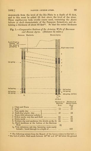 | Keywords: The Quarterly journal of the Geological Society of London (12646145324).jpg 1862 <br> DARWIN BUENOS AYRES <br> 69 <br> downwards from the level of the Rio Plata to a depth of 61 feet <br> and to this must be added 55 feet above the level of the river <br> These argillaceous beds overlie coarse sand containing the Azara <br> labiata a shell characteristic of the Pampean formation and at- <br> taining a thickness of about 93 feet So that the entire thickness <br> Fig 1- <br> – Comparative Sections of the Artesian Wells of Bar rams <br> and Buenos Ay res Distance 3f miles <br> Buenos Ayres <br> Barraeas Riachuelo <br> Level of equi- <br> librium of <br> the princi- <br> pal spring <br> 1st spring <br> 2nd spring <br> 3rd spring <br> ˘4th spring <br> M <br> – J <br> <br> -S <br> h <br> High-water level <br> <br> 1 <br> n <br> H 2nd spring <br> jj 3rd spring <br> 1 4th spring 245 feet <br> 1 2 <br> 470 feet <br> 13 <br> 47 <br> Thickness at <br> Barraeas <br> Feet <br> a Clays and Tosca <br> b Sand <br> c Very sandy clay ~ <br> d Dark -blue plastic clay <br> e Tosca with calcareous nodules I <br> / Yellow sands very fine and fluid 94 <br> g Green sands 66 <br> h Tertiary clay and sandstone for details see fig 2 34 <br> Tc v Hard sandstone at the bottom of the Barraeas <br> Well <br> ÂŁ 2 Very calcareous red clay becoming more marly <br> beneath ; bored through to a depth of <br> Thickness at <br> Buenos Ayres <br> Feet <br> 57 <br> 51 <br> <br> 52 <br> 45 <br> 62 <br> 33 <br> 225 <br> The following extract from the Report of the borers relates to this bed ” <br> The bed of yellow fluid sands between 18 m 60 and 47 m '20 below the ground 35328028 109632 51125 Page 69 Text v 19 http //www biodiversitylibrary org/page/35328028 1863 Geological Society of London NameFound Azara labiata Biodiversity Heritage Library The Quarterly journal of the Geological Society of London v 19 1863 Geology Periodicals Smithsonian Libraries bhl page 35328028 dc identifier http //biodiversitylibrary org/page/35328028 smithsonian libraries Information field Flickr posted date ISOdate 2014-02-20 Check categories 2015 August 26 CC-BY-2 0 BioDivLibrary https //flickr com/photos/61021753 N02/12646145324 2015-08-27 11 59 44 cc-by-2 0 PD-old-70-1923 The Quarterly journal of the Geological Society of London 1863 Photos uploaded from Flickr by Fæ using a script |