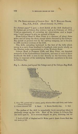Keywords: The Quarterly journal of the Geological Society of London (14096419983).jpg X02 <br> T MELLARD EEADE ON THE <br> 14 The Drift-deposits of CoLwrN Bat By T Mellard Reade <br> Esq C E P G S Eead January 14 1885 <br> In a former paper I gave a short sketch of the drift disclosed in <br> the baliast-pit at Colwyn-Bay station ;' and as in Pebruary of 1884 <br> I had an opportunity of extending my observations over a larger <br> area I now propose to give an account of them <br> From Colwyn Head to Ehos Point is a distance of about three <br> miles; and all along the shore except where obscured by the Colwyn- <br> Bay parade or grassed over by the railway company are to be seen <br> in cliffs excellent sections of the drift <br> This drift extending backward to the foot of the hills which <br> sweep in a curve from headland to headland rests nearly wholly on <br> the Silurian rocks representatives of the Wenlock Shale <br> Colwyn Head or Penmaen Cliffs and Bhos Point are denuded <br> remnants of the Carboniferous Limestone and near to each of these <br> headlands the drift is seen to rest directly on the limestone there <br> being no exposure of the underlying Silurians anywhere to be seen <br> in Colwyn Bay <br> Pig 1 ” Section just beyond the Cottage west of the Colwyn-Bay Hotel <br> 1 Grey Till packed fiill of stones partly Silurian Slate and Grits and Carbo- <br> niferous Limestone <br> 2 Cream-coloured Till 3 Sand 4 Brown Boulder-clay 5 Soil <br> The surface of the drift is remarkably level excepting where it <br> gradually creeps up the hills Most of the houses in Colwyn Bay <br> are built upon it It is crescent-shaped on plan thinning out to- <br> Drift of N W of England and N Wales part ii Quart Journ Geol So8 <br> vol xxxix p 111 37046944 114009 51125 Page 102 Text 41 http //www biodiversitylibrary org/page/37046944 1885 Geological Society of London Biodiversity Heritage Library The Quarterly journal of the Geological Society of London v 41 1885 Geology Periodicals Smithsonian Libraries bhl page 37046944 dc identifier http //biodiversitylibrary org/page/37046944 smithsonian libraries Information field Flickr posted date ISOdate 2014-04-30 Check categories 2015 August 26 CC-BY-2 0 BioDivLibrary https //flickr com/photos/61021753 N02/14096419983 2015-08-26 04 52 04 cc-by-2 0 PD-old-70-1923 The Quarterly journal of the Geological Society of London 1885 Photos uploaded from Flickr by Fæ using a script
