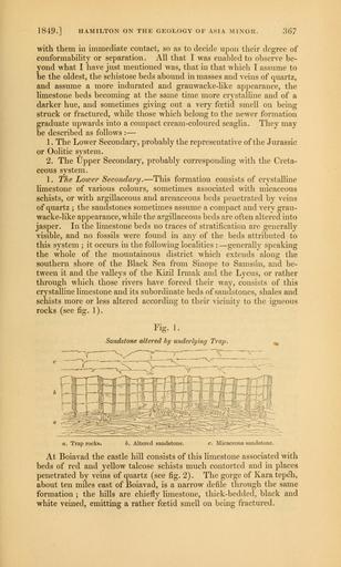 | Keywords: The Quarterly journal of the Geological Society of London (12645216545).jpg 1849 <br> HAMILTON ON THE GEOLOGY OF ASIA MINOR <br> 'd 7 <br> with them in immediate contact so as to decide upon their degree of <br> conformabiHty or separation All that I was enabled to observe be- <br> yond what I have just mentioned was that in that which I assume to <br> be the oldest the schistose beds abound in masses and veins of quartz <br> and assume a more indurated and grauwacke-like appearance the <br> limestone beds becoming at the same time more crystalline and of a <br> darker hue and sometimes giving out a very foetid smell on being <br> struck or fractured while those which belong to the newer formation <br> graduate upwards into a compact cream-coloured scaglia They may <br> be described as follows ” <br> 1 The Lower Secondary probably the representative of the Jurassic <br> or Oolitic system <br> 2 The Upper Secondary probably corresponding with the Creta- <br> ceous system <br> 1 The Lower Secondary ” This formation consists of crystalline <br> limestone of various colours sometimes associated with micaceous <br> schists or with argillaceous and arenaceous beds penetrated by veins <br> of quartz ; the sandstones sometimes assume a compact and very grau- <br> wacke-like appearance while the argillaceous beds are often altered into <br> jasper In the limestone beds no traces of stratification are generally <br> visible and no fossils were found in any of the beds attributed to <br> this system ; it occurs in the following localities ” generally speaking <br> the whole of the mountainous district which extends along the <br> southern shore of the Black Sea from Sinope to Samsim and be- <br> tween it and the valleys of the Kizil Irmak and the Lycus or rather <br> through which those rivers have forced their way consists of this <br> crystalline limestone and its subordinate beds of sandstones shales and <br> schists more or less altered according to their vicinity to the igneous <br> rocks see fig 1 <br> Fig 1 <br> Sandstone altered by underlying Trap <br> a Trap rocks b Altered sandstone c Micaceous sandstone <br> At Boiavad the castle hill consists of this limestone associated with <br> beds of red and yellow talcose schists much contorted and in places <br> penetrated by veins of quartz see fig 2 The gorge of Kara tep«ih <br> about ten miles east of Boiavad is a narrow defile through the same <br> formation ; the hills are chiefly limestone thick-bedded black and <br> white veined emitting a rather foetid smell on being fractured 35269017 109512 51125 Page 367 Text v 5 http //www biodiversitylibrary org/page/35269017 1849 Geological Society of London NameFound Lycus NameConfirmed Lycus EOLID 110488 NameBankID 3002239 NameFound Sinope NameConfirmed Sinope EOLID 8898261 NameBankID 4344118 Biodiversity Heritage Library The Quarterly journal of the Geological Society of London v 5 1849 Geology Periodicals Smithsonian Libraries bhl page 35269017 dc identifier http //biodiversitylibrary org/page/35269017 smithsonian libraries Information field Flickr posted date ISOdate 2014-02-20 Check categories 2015 August 26 CC-BY-2 0 BioDivLibrary https //flickr com/photos/61021753 N02/12645216545 2015-08-27 10 57 07 cc-by-2 0 PD-old-70-1923 The Quarterly journal of the Geological Society of London 1849 Photos uploaded from Flickr by Fæ using a script |