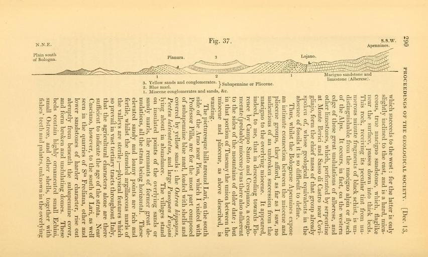 | Keywords: The Quarterly journal of the Geological Society of London (12645174895).jpg 290 <br> PROCEEDINGS OF THE GEOLOGICAL SOCIETY Dec 13 <br> c <br> rt _0 5j o <br> O bo <br> whicli succeeds to the west for the latter is only <br> slightly inclined to the east and is a hard mica- <br> ceous true macigno sandstone which flaglike <br> near the surface passes down into thick beds <br> This rock receiving its peculiar tint from nu- <br> merous minute fragments of black schist is un- <br> distinguishable from the macigno alpin or flysch <br> of the Alps It occurs in fact on the western <br> edge of those great undulations of alberese and <br> other limestones which perforated by serpentine <br> at Monte Berici and Sasso di Castro near Covi- <br> gliajo form the chief mass of that group already <br> spoken of whose geological equivalents in the <br> absence of fossils it is so difficult to define <br> Thus whilst the Bolognese Apennines expose <br> an intimate connection between the miocene and <br> pliocene groups they aiford as far as I saw no <br> indications of an unbroken succession from the <br> macigno to the overlying miocene It appeared <br> indeed to me that in descending towards Flo- <br> rence by Campo Santo and Crespiano a conglo- <br> merate probably miocene was there also adherent <br> to the sides of the mountains of older date ; but <br> in that portion of Tuscany the union between the <br> miocene and pliocene as above described is <br> wanting <br> The picturesque hills around Lari on the south <br> side of the Arno near Pisa which I visited with <br> Professor Pilla are for the most part composed <br> of subapennine blue marl loaded with shells and <br> covered by yellow sands ; the Ostrea hippopuSy <br> Pecten laticostatus and large Panopcea Favjasi <br> lying about in abundance The villages stand <br> on insulated points of the overlying sands or <br> sandy marls the remnants of former great de- <br> nudations all the strata being horizontal These <br> elevated sandy and loamy points are rich and <br> fertile whilst the denuded argillaceous marls of <br> the valleys are sterile ; ” physical features which <br> so prevail in vast tertiary tracts throughout Italy <br> that the agricultural characters alone are there <br> sufficient to indicate the age of the strata Near <br> Casciano however to the south of Lari as well <br> seen in the quarries of S Frediana other and <br> lower sandstones of harder character rise out <br> abruptly from beneath the subapennine cover <br> and form broken and undulating domes These <br> beds contain highly ornamented small Echini <br> small Ostreae and other shells together with <br> fishes' teeth and palates unknown in the overlying 35268934 109512 51125 Page 290 Text v 5 http //www biodiversitylibrary org/page/35268934 1849 Geological Society of London NameFound Echini NameConfirmed Echini NameFound Ostrea NameConfirmed Ostrea EOLID 10719983 NameBankID 2692450 NameFound Ostreae NameFound Pecten laticostatus NameConfirmed Pecten laticostatus Gray 1835 NameFound Pilla NameConfirmed Pilla NameBankID 4574946 Biodiversity Heritage Library The Quarterly journal of the Geological Society of London v 5 1849 Geology Periodicals Smithsonian Libraries bhl page 35268934 dc identifier http //biodiversitylibrary org/page/35268934 smithsonian libraries Information field Flickr posted date ISOdate 2014-02-20 Check categories 2015 August 26 CC-BY-2 0 BioDivLibrary https //flickr com/photos/61021753 N02/12645174895 2015-08-27 10 53 58 cc-by-2 0 PD-old-70-1923 The Quarterly journal of the Geological Society of London 1849 Photos uploaded from Flickr by Fæ using a script |