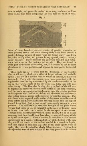| Keywords: The Quarterly journal of the Geological Society of London (12645076783).jpg 1848 NICOL ON RECENT FORMATIONS NEAR EDINBURGH 21 <br> tons in weight and generally derived from trap sandstone or lime- <br> stone rocks like those composing the coal-field on which it rests <br> Fig 2 <br> Some of these boulders however consist of granite mica-slate or <br> other primary strata and must consequently have been carried a <br> greater distance as none of these rocks are found nearer than from <br> forty-five to fifty miles and granite in any quantity only at seventy <br> miles' distance These boulders are generally rounded and water- <br> worn but some on the contrary are angular They are found in <br> every part of the mass of blue clay but as it seemed to me in more <br> abundance in certain portions and apparently arranged in horizontal <br> lines <br> These facts appear to prove that the deposition of this boulder <br> clay or till was gradual ” the effect of long-continued and variable <br> agents ; and not of a sudden rush of water or debacle as has been <br> imagined The whole phsenomena seem more consistent with the <br> supposition that the clay was formed by the continuous action of the <br> sea on the various strata of the subjacent coal-field than with any <br> other theory The blue clay forming the great bulk of the till may <br> be regarded as merely the decomposed shales of the coal formation <br> and the sands as comminuted sandstones even the relative position <br> of the deposits with the blue clay below and a browner and more sandy <br> clay resting upon it as seen in the sections favours this opinion The <br> soft shales when exposed to the action of the waves would be wasted <br> away before the harder sandstones and trap rocks and the deposit <br> formed from their destruction would consequently occupy a lower <br> position The boulders may have been brought to the place where <br> we now find them by ice or entangled in the roots of floating trees <br> or in any other mode now in action for the transport of rock masses <br> Though mixed up irregularly with the mass of clay it is by no means <br> necessary that they should have been always transported along with it <br> or by the same agent Were a number of boulders at the present <br> day dropped on a mass of soft semifluid clay at the bottom of the sea <br> they would not remain on the surface but sink in it to various depths <br> and thus appear to have been deposited by the same agents when in <br> reality they were deposited by wholly different causes Neither does <br> the apparent want of stratification in the clay prove it to have been 35268655 109512 51125 Page 21 Text v 5 http //www biodiversitylibrary org/page/35268655 1849 Geological Society of London Biodiversity Heritage Library The Quarterly journal of the Geological Society of London v 5 1849 Geology Periodicals Smithsonian Libraries bhl page 35268655 dc identifier http //biodiversitylibrary org/page/35268655 smithsonian libraries Information field Flickr posted date ISOdate 2014-02-20 Check categories 2015 August 26 CC-BY-2 0 BioDivLibrary https //flickr com/photos/61021753 N02/12645076783 2015-08-27 10 55 09 cc-by-2 0 PD-old-70-1923 The Quarterly journal of the Geological Society of London 1849 Photos uploaded from Flickr by Fæ using a script |