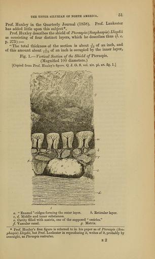 Keywords: The Quarterly journal of the Geological Society of London (14053245336).jpg THE UPPER SILTTEIAN OF NORTH AMERICA <br> 51 <br> Prof Huxley in tlie Quarterly Journal 1858 Prof Lankester <br> has added little upon this subject <br> Prof Huxley describes the shield of Pterasjns Scapliaspis Lloydn <br> as consisting of four distinct layers which he describes thus I c <br> p 275 ” <br> The total thickness of the section is about q of an inch and <br> of this amount about y - of an inch is occuiDied by the inner layer <br> Pig I ” Vertical Section of the Shield o/Pteraspis <br> Magnified 100 diameters <br> Copied from Prof Huxley's figure Q J G- S vol xiv pi xv fig 1 <br> a Enamel -ridges forming the outer layer b Eeticular layer <br> c d Middle and inner substances <br> e Cavity filled with matrix one of the supposed ossicles <br> / Vascular canal g Matrix <br> Prof Huxley's first figure is referred to in his paper as of Pteraspis Sea- <br> phaspis Lloydii but Prof Lankester in reproducing it writes of it probably by <br> o-versight as Fteraspis rostratus <br> e2 37046889 114009 51125 Page 51 Text 41 http //www biodiversitylibrary org/page/37046889 1885 Geological Society of London NameFound Fteraspis rostratus NameConfirmed Pteraspis rostrata NameFound Pteraspis NameConfirmed Pteraspis EOLID 4655774 NameBankID 4322058 NameFound Scapliaspis Biodiversity Heritage Library The Quarterly journal of the Geological Society of London v 41 1885 Geology Periodicals Smithsonian Libraries bhl page 37046889 dc identifier http //biodiversitylibrary org/page/37046889 smithsonian libraries Information field Flickr posted date ISOdate 2014-04-30 Check categories 2015 August 26 CC-BY-2 0 BioDivLibrary https //flickr com/photos/61021753 N02/14053245336 2015-08-26 04 52 58 cc-by-2 0 PD-old-70-1923 The Quarterly journal of the Geological Society of London 1885 Photos uploaded from Flickr by Fæ using a script |