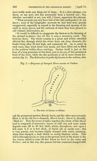 | Keywords: The Quarterly journal of the Geological Society of London (12512902953).jpg 258 PROCEEDINGS OP THE GEOLOGICAL SOCIETX April 10 <br> have really made any thing out of these It is a first attempt you <br> know on my part and has necessarily heen a hurried one ; but <br> whether successful or not you will I know appreciate the attempt <br> What accounts you may have had of the late earthquake I do not <br> know ; most of the telegraphic accounts we had here were greatly <br> exaggerated especially in regard to the Assuring and opening of the <br> earth in many places and the outburst of what they were pleased to <br> call volcanic mud-craters c <br> It would be difficult to exaggerate the facts as to the fissTiring of <br> the ground in places ; hiit all this is only a secondary result The <br> facts are these The whole country is a great and widely extended <br> alluvial flat through which the rivers have cut deep channels the <br> banks being often 50 feet high and commonly 30 As is usual in <br> such cases they wind about very much and have filled and re-filled <br> in the portions within these curvings Cachar itself is just at the <br> base of a long peninsula of this kind just in the eye of this prominent <br> bend of the river while the flat peninsula is all of more recent for- <br> mation fig 1 The distinction is perfectly known to the natives who <br> Pig 1 ” Diagram of changed River-course at Cachar <br> a The town of Cachar or Silchar <br> call the permanent portion Kandy lands and the other more recently <br> filled in of the old river-channels Bhurti lands ; hhurti is HteraUy <br> ' filled in ' Now for scores of miles together the whole of this hhurti <br> land is composed of successive layers of stiff clay and mere sandy <br> deposits some 25 to 30 feet thick which throughout rest upon a <br> bed some 3 5 or 6 feet thick of bluish silt or sandy ooze ; this <br> is very porous and becomes highly charged with water assuming <br> when thus charged a dark bluish or nearly blackish colour This <br> bed is throughout at or close to the present level of the water in the <br> dry season which is some 30 feet below its level in the rains and <br> freshes ; and in this way this porous bed has remained charged with 34985267 108770 51125 Page 258 Text v 28 http //www biodiversitylibrary org/page/34985267 1872 Geological Society of London Biodiversity Heritage Library The Quarterly journal of the Geological Society of London v 28 1872 Geology Periodicals Smithsonian Libraries bhl page 34985267 dc identifier http //biodiversitylibrary org/page/34985267 smithsonian libraries Information field Flickr posted date ISOdate 2014-02-14 Check categories 2015 August 26 CC-BY-2 0 BioDivLibrary https //flickr com/photos/61021753 N02/12512902953 2015-08-27 10 00 27 cc-by-2 0 PD-old-70-1923 The Quarterly journal of the Geological Society of London 1872 Photos uploaded from Flickr by Fæ using a script |