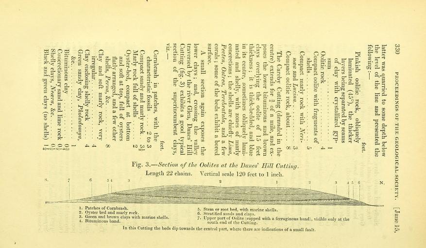 Keywords: The Quarterly journal of the Geological Society of London (12512100673).jpg 330 <br> PROCEEDINGS OF THE GEOLOGICAL SOCIETY June 15 <br> latter was quarried to some depth below <br> the level of the Ime and presented the <br> following ” <br> feet <br> Pinkish oolitic rock obliquely <br> laminated 45° the thicker <br> layers being separated by seams <br> of clay with crystallized gyp- <br> sum 1 <br> Oolitic rock 4 <br> Compact oolite with fragments of <br> shells 5 <br> Compact marly rock with Neri- <br> ncBu and Lucina 3 <br> Compact oolitic rock about 8 <br> The Careby Cutting denuded in the <br> centre extends for f of a mile and ex- <br> poses the lower bituminous and brown <br> clays overlying the oolite of 15 feet <br> thickness ; it is thick-bedded and blue <br> ia its centre sometimes obliquely lami- <br> nated and shelly with zones of marly <br> concretions ; the shells are chiefly Lima <br> Pecten Ostrea Terehratula and a few <br> corals ; some of the beds exhibit a bored <br> surface <br> A small section again exposes the <br> lower clays ; and crossing the valley <br> traversed by the river Glen Danes' Hill <br> Cutting fig 3 exhibits a good typical <br> section of the superincumbent clays <br> viz ” <br> feet <br> Cornbrash in patches with the <br> characteristic fossils 2 to 3 <br> Compact sandy and marly rock 3 <br> Marly rock full of shells' 2 <br> Oyster-bed compact at bottom <br> and soft at top full of oysters <br> flatly arranged and a few other <br> shells Perna c 8 <br> Clay and soft marly rock very <br> irregular 4 <br> Clay enclosing shelly rock 4 <br> Green sandy clay Pholadomya <br> c 1 <br> Bituminous clay Of <br> Concretionary sand and lime rock 0-i- <br> Shelly clays Necera c 0\ <br> Black and green clays no shells J <br> 5i <br> s -3 <br> CO H <br> K J2 O – <br> S £ -T - c <br> 3 u 2 o 34983461 108767 51125 Page 330 Text v 9 http //www biodiversitylibrary org/page/34983461 1853 Geological Society of London NameFound Lucina NameConfirmed Lucina EOLID 10720506 NameBankID 4935025 NameFound Ostrea NameConfirmed Ostrea EOLID 10719983 NameBankID 2692450 NameFound Pecten NameConfirmed Pecten EOLID 10719936 NameBankID 2692292 NameFound Perna NameConfirmed Perna EOLID 59522 NameBankID 4935024 NameFound Pholadomya NameConfirmed Pholadomya EOLID 4744545 NameBankID 4294325 Biodiversity Heritage Library The Quarterly journal of the Geological Society of London v 9 1853 Geology Periodicals Smithsonian Libraries bhl page 34983461 dc identifier http //biodiversitylibrary org/page/34983461 smithsonian libraries Information field Flickr posted date ISOdate 2014-02-14 Check categories 2015 August 26 CC-BY-2 0 BioDivLibrary https //flickr com/photos/61021753 N02/12512100673 2015-08-27 09 55 24 cc-by-2 0 PD-old-70-1923 The Quarterly journal of the Geological Society of London 1853 Photos uploaded from Flickr by Fæ using a script |