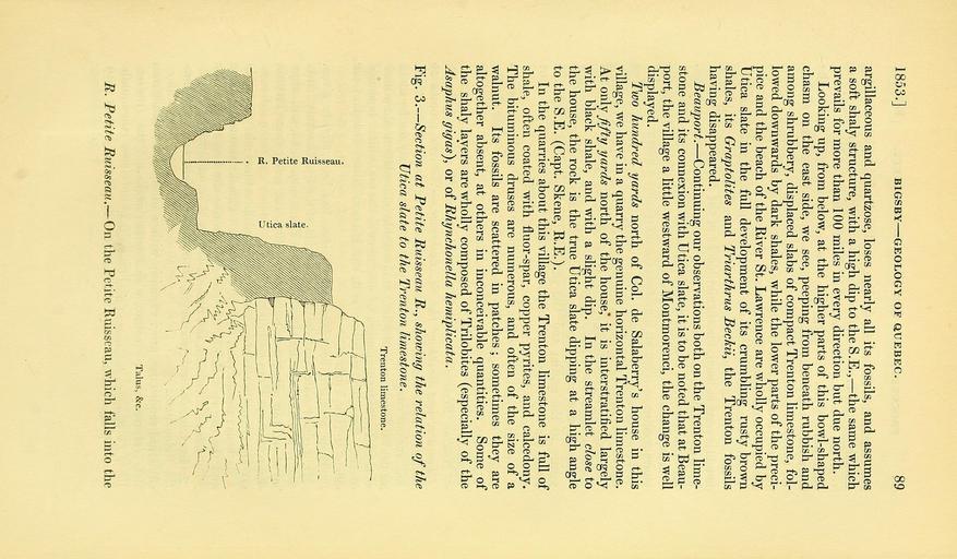 | Keywords: The Quarterly journal of the Geological Society of London (12511800315).jpg 1853 <br> BIGSBY GEOLOGY OF aUEBEC <br> 89 <br> argillaceous and quartzose loses nearly all its fossils and assumes <br> a soft shaly structure with a high dip to the S E the same which <br> prevails for more than 100 miles in every direction but due north <br> Looking up from below at the higher parts of this bowl-shaped <br> chasm on the east side we see peeping from beneath rubbish and <br> among shrubbery displaced slabs of compact Trenton limestone fol- <br> lowed downwards by dark shales while the lower parts of the preci- <br> pice and the beach of the River St Lawrence are wholly occupied by <br> Utica slate in the full development of its crumbling rusty brown <br> shales its Graptolites and Triarthrus Beckii the Trenton fossils <br> having disappeared <br> Beauport Continuing our observations both on the Trenton lime- <br> stone and its connexion with Utica slate it is to be noted that at Beau- <br> port the village a little westward of Montmorenci the change is well <br> displayed <br> Two hundred yards north of Col de Salaberry's house in this <br> village we have in a quarry the genuine horizontal Trenton limestone <br> At oxAj ffty yards north of the house ' it is interstratified largely <br> with black shale and with a slight dip In the streamlet close to <br> the house the rock is the true Utica slate dipping at a high angle <br> to the S E Capt Skene R E <br> In the quarries about this village the Trenton limestone is full of <br> shale often coated with fluor-spar copper pyrites and calcedony <br> The bituminous druses are numerous and often of the size of a <br> walnut Its fossils are scattered in patches ; sometimes they are <br> altogether absent at others in inconceivable quantities Some of <br> the shaly layers are wholly composed of Trilobites especially of the <br> Asaphus gigas or oi Rhynchonella hemiplicata <br> Fig 3 Section at Petite Ruisseau R showing the relation of the <br> Utica slate to the Trenton limestone <br> Trenton limestone <br> Talus c <br> R Petite Ruisseau On the Petite Ruisseau Avhich falls into the 34983192 108767 51125 Page 89 Text v 9 http //www biodiversitylibrary org/page/34983192 1853 Geological Society of London NameFound Asaphus gigas NameConfirmed Asaphus I gigas Reed NameFound Graptolites NameConfirmed Graptolites NameBankID 423327 NameFound Rhynchonella NameConfirmed Rhynchonella EOLID 4328553 NameBankID 4331849 NameFound Triarthrus NameConfirmed Triarthrus EOLID 4324679 NameBankID 2875648 Biodiversity Heritage Library The Quarterly journal of the Geological Society of London v 9 1853 Geology Periodicals Smithsonian Libraries bhl page 34983192 dc identifier http //biodiversitylibrary org/page/34983192 smithsonian libraries Information field Flickr posted date ISOdate 2014-02-14 Check categories 2015 August 26 CC-BY-2 0 BioDivLibrary https //flickr com/photos/61021753 N02/12511800315 2015-08-27 10 00 22 cc-by-2 0 PD-old-70-1923 The Quarterly journal of the Geological Society of London 1853 Photos uploaded from Flickr by FĂŚ using a script |