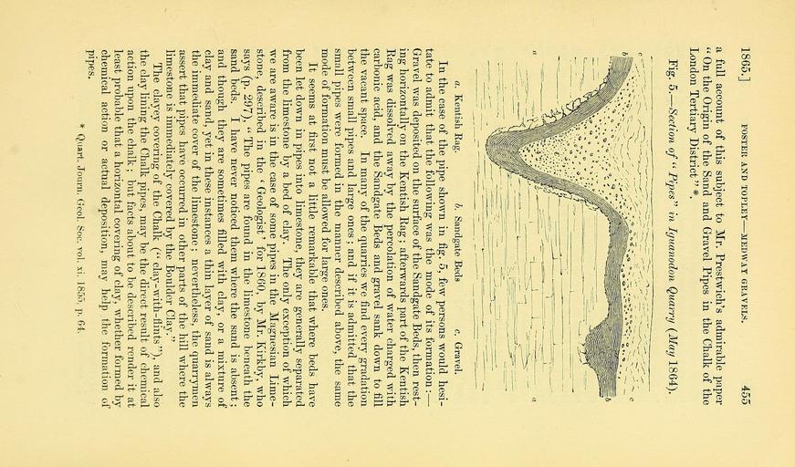 | Keywords: The Quarterly journal of the Geological Society of London (12471641734).jpg 1865 <br> FOSTER AND TOPLEY MEDWAT GRAVELS <br> 455 <br> a full account of this subject to Mr Prestwicli's admirable paper <br> On the Origin of the Sand and Gravel Pipes in the Chalk of the <br> London Tertiary District <br> Fig 5 ” Section of Pipes in Iguanodon Quarry May 1864 <br> a Kentish Eag b Sandgate Beds c Gravel <br> In the case of the pipe shown in fig 5 few persons would hesi- <br> tate to admit that the following was the mode of its formation ” <br> Gravel was deposited on the surface of the Sandgate Beds then rest- <br> ing horizontally on the Kentish Eag ; afterwards part of the Kentish <br> Rag was dissolved away by the percolation of water charged with <br> carbonic acid and the Sandgate Beds and gravel sank down to fill <br> the vacant space In many of the quarries we find every gradation <br> between small pipes and large ones ; and if it is admitted that the <br> small pipes were formed in the manner described above the same <br> mode of formation must be allowed for large ones <br> It seems at first not a little remarkable that where beds have <br> been let down in pipes into limestone they are generally separated <br> from the Kmestone by a bed of clay The only exception of which <br> we are aware is in the case of some pipes in the Magnesian Lime- <br> stone described in the ' Geologist' for 1860 by Mr Kirkby who <br> says p 297 The pipes are found in the limestone beneath the <br> sand beds I have never noticed them where the sand is absent ; <br> and though they are sometimes filled with clay or a mixture of <br> clay and sand yet in these instances a thin layer of sand is always <br> the immediate cover of the limestone ; nevertheless the quarrymen <br> assert that pipes have occurred in other parts of the hill where the <br> limestone is immediately covered by the Boulder Clay <br> The clayey covering of the Chalk claj'-with-flints and also <br> the clay lining the Chalk pipes may be the direct result of chemical <br> action upon the chalk ; but facts about to be described render it at <br> least probable that a horizontal covering of clay whether formed by <br> chemical action or actual deposition may help the formation of <br> pipes <br> Quart Jouvti tcoI i oc rol xi IS' p Gi 34892133 108495 51125 Page 455 Text v 21 http //www biodiversitylibrary org/page/34892133 1865 Geological Society of London NameFound Iguanodon NameConfirmed Iguanodon EOLID 4530741 NameBankID 4204832 Biodiversity Heritage Library The Quarterly journal of the Geological Society of London v 21 1865 Geology Periodicals Smithsonian Libraries bhl page 34892133 dc identifier http //biodiversitylibrary org/page/34892133 smithsonian libraries Information field Flickr posted date ISOdate 2014-02-12 Check categories 2015 August 26 CC-BY-2 0 BioDivLibrary https //flickr com/photos/61021753 N02/12471641734 2015-08-27 09 54 36 cc-by-2 0 PD-old-70-1923 The Quarterly journal of the Geological Society of London 1865 Photos uploaded from Flickr by Fæ using a script |