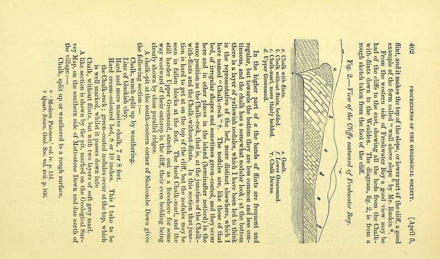 | Keywords: The Quarterly journal of the Geological Society of London (12471273733).jpg 402 <br> PROCEEDINGS OF THE GEOLOGICAL SOCIETY April 5 <br> flint and it makes the top of the slope or lower part of the cliif a good <br> example of the form called wall above slope by Mr Buskin <br> Prom the western side of Freshwater Bay a good view may be <br> had of the cUiFs to the east showing all the beds from the Chalk- <br> with-flints down to the Wealden The diagram fig 2 is from a <br> rough sketch taken from the foot of the cliff <br> Fig 2 ” View of the Cliff's eastward of Freshwater Bay <br> a Chalk with flints e Gault <br> h Chalk without flints bedded f Lower Greensand <br> c Chalk-marl more thinly bedded r Chalk Downs <br> d Upper Greensand <br> In the higher part of a the bands of flints are frequent and <br> regular but towards the bottom they are less common and less con- <br> tinuous and the chalk has a somewhat nodular look ; at the bottom <br> there is a layer of yellowish nodules which I have been led to think <br> is the representative of the bed more distinct elsewhere which I <br> have named Chalk- rock f The nodules are like those of that <br> bed of irregular shapes and sometimes green-coated and they occur <br> here and in other places in the island hereinafter noticed in the <br> same position as the Chalk-rock that is at the junction of the Chalk- <br> with-flints and the Chalk- without-flints In this section that junc- <br> tion is hard to get at on the top of the cliff but the nodules may be <br> seen in fallen blocks at the foot The hard Chalk-marl and the <br> still harder Upper Greensand stretch out as a foreshore for some <br> way westward of their outcrop in the chff their even bedding being <br> clearly shown by close parallel ridges <br> A chalk-pit at the south-eastern corner of Shalcombe Down gives <br> the following section ; ” <br> Chalk much split up by weathering <br> Line of blackish clay <br> Hard and more massive chalk 7 or 8 feet <br> Hard cream-coloured bed 8 or 10 inches This I take to be <br> the Chalk -rock ; green-coated nodules occur at the top which <br> is well marked whilst it passes down into <br> Chalk without flints but with two layers of soft grey marl <br> A like section is shown by the pit marked on the Geological Sur- <br> vey Map on the southern side of Mottestone Down and due north of <br> the village ” <br> Chalk split up or weathered to a rough surface <br> ' Modern Painters ' vol iv p 151 <br> t Quart Joiu n Geol Soc vol xvii p 166 <br> I 34892076 108495 51125 Page 402 Text v 21 http //www biodiversitylibrary org/page/34892076 1865 Geological Society of London Biodiversity Heritage Library The Quarterly journal of the Geological Society of London v 21 1865 Geology Periodicals Smithsonian Libraries bhl page 34892076 dc identifier http //biodiversitylibrary org/page/34892076 smithsonian libraries Information field Flickr posted date ISOdate 2014-02-12 Check categories 2015 August 26 CC-BY-2 0 BioDivLibrary https //flickr com/photos/61021753 N02/12471273733 2015-08-27 10 02 33 cc-by-2 0 PD-old-70-1923 The Quarterly journal of the Geological Society of London 1865 Photos uploaded from Flickr by Fæ using a script |