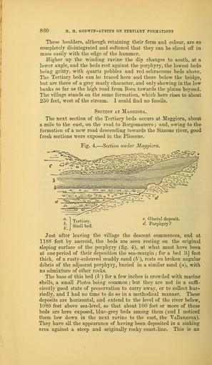 | Keywords: The Quarterly journal of the Geological Society of London (14072723631).jpg 860 <br> H H GODWIN-AUSTEX ON TERTIARY FORirATlO S <br> These boulders although retaining their form and colour are so <br> completely disintegrated and softened that they can be sliced off in <br> mass easily with the edge of the hammer <br> Higher up the winding ravine the dip changes to soutb at a <br> lower angle and the beds rest against the porphyry the lowest beds <br> being gritty with quartz pebbles and red ochraceous beds above <br> The Tertiary beds can be traced here and there below the bridge <br> but are there of a grey marly character and only showing in the low <br> banks as far as the high road from Boca towards the plains beyond <br> The village stands on the same formation which here rises to about <br> 250 feet west of the stream I could find no fossils <br> Section at IIaggiora <br> The next section of the Tertiary beds occurs at Maggiora about <br> a mile to the east on the road to Borgomanero ; and owing to the <br> formation of a new road descending towards the Sizzone river good <br> fresh sections were exposed in the Pliocene <br> Section under Maggiora <br> r S Cr <br> 1 Tertiary <br> ; r Shell bed <br> c Glacial deisosit <br> d Porphyry <br> Just after leaving the village the descent commences and at <br> 1188 feet by aneroid the beds are seen resting on the original <br> sloping surface of the porphyry fig 4 at what must have been <br> at one period of their deposition the sea-margin ; for a bed 3 feet <br> thick of a rusty-coloured muddy sand 6' rests on broken angular <br> debris of the adjacent porphyry buried in a similar sand a with <br> no admixture of other rocks <br> The base of this bed b' for a few inches is crowded with marine <br> shells a small Pecten being common ; but they are not in a suffi- <br> ciently good state of preservation to carry away or to collect hur- <br> riedly and I had no time to do so in a methodical manner These <br> deposits are horizontal and extend to the level of the river below <br> 1089 feet above sea-level so that about 100 feet or more of these <br> beds are here exposed blue-grej' beds among them and 1 noticed <br> them low down in the next ravine to the east the Yallanzana <br> They have all the appearance of having been deposited in a sinking <br> area against a steep and originally rocky coast-line This is an 36941737 113697 51125 Page 860 Text 40 http //www biodiversitylibrary org/page/36941737 1884 Geological Society of London NameFound Pecten NameConfirmed Pecten EOLID 10719936 NameBankID 2692292 Biodiversity Heritage Library The Quarterly journal of the Geological Society of London v 40 1884 Geology Periodicals Smithsonian Libraries bhl page 36941737 dc identifier http //biodiversitylibrary org/page/36941737 smithsonian libraries Information field Flickr posted date ISOdate 2014-04-30 Check categories 2015 August 26 CC-BY-2 0 BioDivLibrary https //flickr com/photos/61021753 N02/14072723631 2015-08-26 04 54 21 cc-by-2 0 PD-old-70-1923 The Quarterly journal of the Geological Society of London 1884 Photos uploaded from Flickr by Fæ using a script |
