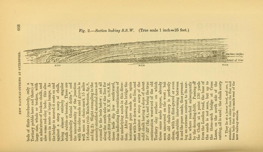 Keywords: The Quarterly journal of the Geological Society of London (14052771316).jpg NEW RAILWAY-CUTTIN AT GUILDFOED <br> 603 <br> beds of flints exclusively only a <br> Tertiary pebble here and there of <br> large size whole or broken with <br> an admixture of broken chalk and <br> also some red-clay beds ; this also <br> occurs in nests or large lumps As <br> the bridge is neared it rests on and <br> against a steep scarp of chalk <br> being almost entirely angular <br> chalk rubble or breccia These are <br> undoubtedly Glacial drifts and <br> the unconformity of the junction <br> with the older sands and gravels is <br> well seen at chain-mark 15 miles <br> 18 chains vide Main Section fig 8 <br> and fig 2 Slight crumpling in the <br> coarsely stratified material does not <br> extend to the beds below ; and all <br> along the north side of the line for <br> about 200 yards W N W toS S E <br> these beds dip low southward <br> thus indicating the continuation of <br> the underlying sands in this direc- <br> tion After passing the bridge the <br> horizontal pure sands are again <br> met with low down on the line and <br> abut against a steep scarp of the <br> solid chalk having a slope of about <br> 20°-22° fig 4 and being the true <br> continuation westward of the old <br> Tertiary clay surface on which <br> these same sands repose already <br> seen uncovered on the west ; but <br> this old chalk-scarp is perfectly <br> clean with no flint-gravel or even <br> chalk-rubble intervening between <br> it and the pure sands thus present- <br> ing an extreme contrast to its sur- <br> face where reached subsequently <br> by the denuding drift Passing off <br> the Chalk at a point 130 yards <br> from the London road the base of <br> the sands is not seen but up to <br> the three-arch bridge at Cross <br> Lanes on the north side of the <br> cutting all is sand ; the chalk scarp <br> They lie at a lower level and are I <br> consider much older than the flint and <br> loam beds that cap the sands west of the <br> new railway-station <br> i m <br> mm <br> mim <br> 5 <br> OR <br> to <br> 55 <br> o <br> o <br> be 36941438 113697 51125 Page 603 Text 40 http //www biodiversitylibrary org/page/36941438 1884 Geological Society of London Biodiversity Heritage Library The Quarterly journal of the Geological Society of London v 40 1884 Geology Periodicals Smithsonian Libraries bhl page 36941438 dc identifier http //biodiversitylibrary org/page/36941438 smithsonian libraries Information field Flickr posted date ISOdate 2014-04-30 Check categories 2015 August 26 CC-BY-2 0 BioDivLibrary https //flickr com/photos/61021753 N02/14052771316 2015-08-26 05 50 51 cc-by-2 0 PD-old-70-1923 The Quarterly journal of the Geological Society of London 1884 Photos uploaded from Flickr by Fæ using a script |