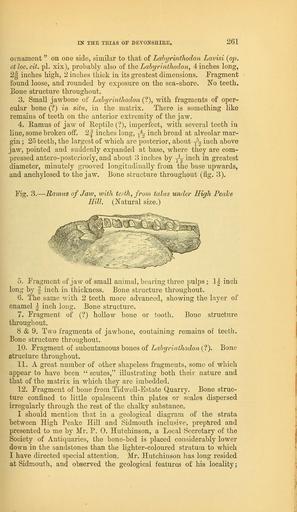 Keywords: The Quarterly journal of the Geological Society of London (14052689136).jpg IN THE TEIAS OF DEVONSHIRE 261 <br> ornament on one side similar to that of Lahyrinthodon Lavisi op <br> et loc cit pi xix probably also of i\iO Lahyrinthodon 4 inches long <br> 2 inches high 2 inches thick in its greatest dimensions Fragment <br> found loose and rounded by exposure on the sea-shore No teeth <br> Bone structure throughout <br> 3 Small jawbone of Lahyrinthodon with fragments of oper- <br> cular bone in situ in the matrix There is something like <br> remains of teeth on the anterior extremity of the jaw <br> 4 Eamus of jaw of Eeptile imperfect with several teeth iu <br> line some broken off 2 inches long j\ inch broad at alveolar mar- <br> gin ; 25 teeth the largest of which are posterior about -f- inch above <br> jaw pointed and suddenly expanded at base where they are com- <br> pressed antero-posteriorly and about 3 inches by y inch in greatest <br> diameter minutely grooved longitudinally from the base upwards <br> and anchylosed to the jaw Bone structure throughout iig 3 <br> Fig 3 ” Ramus of Jaw with teeth from talus under High PeaJce <br> Hill Natural size <br> 5 Fragment of jaw of small animal bearing three i ulps ; 1 inch <br> long by - inch in thickness Bone structure throughout <br> 6 The same with 2 teeth more advanced showing the layer of <br> enamel inch long Bone structure <br> 7 Fragment of hollow bone or tooth Bone structure <br> throughout <br> 8 9 Two fragments of jawbone containing remains of teeth <br> Bone structure throughout <br> 10 Fragment of subcutaneous bones of Lahyrinthodon Bone <br> structure throughout <br> 11 A great number of other shapeless fragments some of which <br> appear to have been scutes illustrating both their nature and <br> that of the matrix in which they are imbedded <br> 12 Fragment of bone from Tidwell-Estate Quarry Bone struc- <br> ture confined to little opalescent thin plates or scales dispersed <br> irregularly through the rest of the chalky substance <br> I should mention that in a geological diagram of the strata <br> between High Peake Hill and Sidmouth inclusive prep red and <br> presented to me by Mr P 0 Hutchinson a Local Secretary of the <br> Society of Antiquaries the bone-bed is placed considerably lower <br> down in the sandstones than the lighter-coloured stratum to which <br> I have directed special attention Mr Hutchinson has long resided <br> at Sidmouth and observed the geological features of his locality ; 36941050 113697 51125 Page 261 Text 40 http //www biodiversitylibrary org/page/36941050 1884 Geological Society of London Biodiversity Heritage Library The Quarterly journal of the Geological Society of London v 40 1884 Geology Periodicals Smithsonian Libraries bhl page 36941050 dc identifier http //biodiversitylibrary org/page/36941050 smithsonian libraries Information field Flickr posted date ISOdate 2014-04-30 Check categories 2015 August 26 CC-BY-2 0 BioDivLibrary https //flickr com/photos/61021753 N02/14052689136 2015-08-26 05 57 07 cc-by-2 0 PD-old-70-1923 The Quarterly journal of the Geological Society of London 1884 Photos uploaded from Flickr by Fæ using a script |