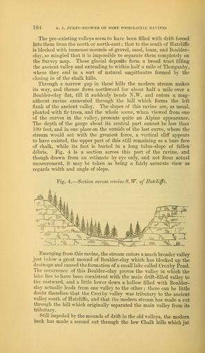 | Keywords: The Quarterly journal of the Geological Society of London (14052672156).jpg 164 <br> A J JUKES-liROWIS E ON SOME POSTGLACIAL EAYINES <br> The pre-existing valleys seem to ha e been filled 'with drift forced <br> into them from the north or north-east ; that to the south of Hatcliffe <br> is blocked with immense mounds of- gravel sand loam and Bonlder- <br> clay so mingled that it is impossible to separate them completely on <br> the Survey map These glacial deposits form a broad tract filling <br> the ancient valley and extending to within half a mile of Thorganby <br> where they end in a sort of natural ampitheatre formed by the <br> closing in of the chalk hills <br> Through a narrow gap in these hills the modern stream makes <br> its way and thence flows northward for about half a mile over a <br> Boulder-clay flat till it suddenly bends JN' W and enters a mag- <br> nificent ravine excavated through the hill which forms the left <br> flank of the ancient valley The slopes of this ravine are as usual <br> planted with fir trees and the whole scene when viewed from one <br> of the curves in the valley presents quite an Alpine appearance <br> The depth of the gorge about its central part cannot be less than <br> 100 feet and in one place on the outside of the last curve where the <br> stream would act with the greatest force a vertical cliff appears <br> to have existed the upper part of this still remaining as a bare face <br> of chalk while its foot is buried in a long talus-slope of fallen <br> debris Tig 4 is a section across this part of the ravine and <br> though drawn from an estimate by eye only and not from actual <br> measurement it may be taken as being a fairly accurate view as <br> regards width and angle of slope <br> Fig 4 ” Section across ravine S W of Hatcliffe <br> Emerging from this ravine the stream enters a much broader valley <br> just below a great mound of Boulder-clay which has blocked up the <br> drainage and caused the formation of a small lake called Croxby Pond <br> The occurrence of this Boulder- clay proves the valley in which the <br> lake lies to have been coexistent with the main drift-fiUed valley to <br> the eastward and a little lower down a hollow filled with Boulder- <br> clay actually leads from one valley to the other ; there can be little <br> doubt therefore that the Croxby valley was tributary to the ancient <br> valley south of Hatcliffe and that the modern stream has made a cut <br> through the hill which originally separated the main vaUey from its <br> tributary <br> Still impeded by the mounds of drift in the old valleys the modern <br> beck has made a second cut through the low Chalk hills which jut 36940935 113697 51125 Page 164 Text 40 http //www biodiversitylibrary org/page/36940935 1884 Geological Society of London Biodiversity Heritage Library The Quarterly journal of the Geological Society of London v 40 1884 Geology Periodicals Smithsonian Libraries bhl page 36940935 dc identifier http //biodiversitylibrary org/page/36940935 smithsonian libraries Information field Flickr posted date ISOdate 2014-04-30 Check categories 2015 August 26 CC-BY-2 0 BioDivLibrary https //flickr com/photos/61021753 N02/14052672156 2015-08-26 05 51 25 cc-by-2 0 PD-old-70-1923 The Quarterly journal of the Geological Society of London 1884 Photos uploaded from Flickr by Fæ using a script |