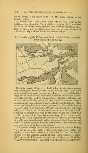 | Keywords: The Quarterly journal of the Geological Society of London (14072584831).jpg 162 <br> A J JUKES-BEOWKE 0 S SOME POSTGLACIAL RAYIXES <br> waters flowed south-eastward to join the main stream in the <br> Calceby valley <br> 2 Valleys near Louth ” Two other similar cases occur in the <br> neighbourhood of Louth The Wolds here see plan fig 2 are inter- <br> sected by two ancient valley-systems both of which are largely occu- <br> pied by drift; and in neither case does the modern watercourse <br> coincide entirely with the line of the ancient valley <br> Y\ 2 ” Plan oflthe Valleys near Louth Scale 1 inch to a mile <br> Drift indicated as in fig 1 <br> The main stream of the river Ludd takes its rise from springs <br> near the village of Welton about 3 miles west of Louth For about <br> a mile this stream runs in the ancient valley over a bottom of Boulder- <br> clay ; but although the old valley still continues eastward as a well- <br> marked hollow the modern stream turns suddenly southward and <br> enters a narrow winding ravine the sides of which are far too steep for <br> the plough and have in consequence been laid out as plantations This <br> ravine has a length of about three quarters of a mile and then opens <br> into a broader valley running eastward and joining the old main <br> valley at a point about one mile and a quarter west of Louth church <br> A tongue of Boulder-clay runs up this broad valley for about half <br> a mile proving it to have been a tributary of the ancient main <br> valley ; the stream therefore has here made a new cut three quarters <br> of a mile long from the main valley into one of its tributaries and <br> thence its course coincides with the continuation of the ancient valley <br> in which the town of Louth now stands <br> The narrow wooded ravine above mentioned is known as Welton <br> Yale and is one of the sights of the neighbourhood of Louth Its <br> jiepth at the southern entrance is about 60 feet and the sudden <br> change from the ordinary scenery of open chalk valleys to a steep- <br> sided ravine which has more the aspect of a Derbyshire or Yorkshire <br> vale is very remarkable The clear beck rippling over its stony bed <br> I 36940933 113697 51125 Page 162 Text 40 http //www biodiversitylibrary org/page/36940933 1884 Geological Society of London Biodiversity Heritage Library The Quarterly journal of the Geological Society of London v 40 1884 Geology Periodicals Smithsonian Libraries bhl page 36940933 dc identifier http //biodiversitylibrary org/page/36940933 smithsonian libraries Information field Flickr posted date ISOdate 2014-04-30 Check categories 2015 August 26 CC-BY-2 0 BioDivLibrary https //flickr com/photos/61021753 N02/14072584831 2015-08-26 05 55 49 cc-by-2 0 PD-old-70-1923 The Quarterly journal of the Geological Society of London 1884 Photos uploaded from Flickr by Fæ using a script |