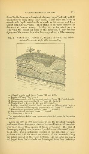 Keywords: The Quarterly journal of the Geological Society of London (14052658026).jpg or MONTE SOMMA AND VESUVIUS <br> Ill <br> the valloni is the more or less deep incision or cupa a8 locally called <br> which furrows them along their spine These cnpe are often of <br> considerable depth occasionally as much as 20 metres and have <br> almost perpendicular walls Their origin in all cases seems to be <br> the result of human agency As they play an important part in <br> odi fying the superficial form of the mountain a few remarks <br> a projpos of the manner in which they are produced will be necessary <br> Fig 2 ” Section in tJie Vallone St Patrizio <br> about the bbO-metre <br> contour-line on the right side in ascenclimg <br> a Alluvial breccia sand c Phases VII and VIII <br> h Pumice of Phase VI Period 4 <br> c Yellow earthy ash with fragments of pumice PHASE VI Periods 2 a nd 3 <br> d Compact grey pumice and lapilli Phase VI Period 1 <br> ' Vegetable soil Phases V IV and III Period 4 <br> e Regularly stratij ed rounded lapilli and sand of different sizes with a <br> few fragments of black spongy pumiceous scoria Phase III Pej'iod 3 <br> f Black compact pumiceous scoria Phase III Period 2 <br> g Light and white pumice Phase III Period 1 <br> h Ancient lava Phase I <br> This section is intended to show the erosion of one bed before the deposition <br> of another <br> Above the 300- or 400-metre contour-line the two chief vegetable <br> products of Monte Somma are chestnut trees and bushes and an under- <br> growth of two or three species of broom or Genista The first of <br> these supply sapling poles brushwood and charcoal ; the second brush- <br> wood only The mountaineers occupied in the collection of these <br> products make both the ascent and descent of the mountain along <br> the ridges instead of the valley-bottoms As the latter are rough <br> and jagged from the lava-beds and intercepted from time to time by 36940872 113697 51125 Page 111 Text 40 http //www biodiversitylibrary org/page/36940872 1884 Geological Society of London NameFound Genista NameConfirmed Genista EOLID 13440 NameBankID 2650919 Biodiversity Heritage Library The Quarterly journal of the Geological Society of London v 40 1884 Geology Periodicals Smithsonian Libraries bhl page 36940872 dc identifier http //biodiversitylibrary org/page/36940872 smithsonian libraries Information field Flickr posted date ISOdate 2014-04-30 Check categories 2015 August 26 CC-BY-2 0 BioDivLibrary https //flickr com/photos/61021753 N02/14052658026 2015-08-26 05 56 00 cc-by-2 0 PD-old-70-1923 The Quarterly journal of the Geological Society of London 1884 Photos uploaded from Flickr by Fæ using a script