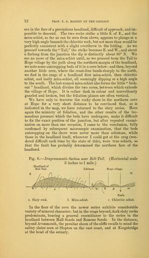 Keywords: The Quarterly journal of the Geological Society of London (13889134969).jpg 12 <br> PEOF T G BONNET ON THE GEOLOGY <br> sea in the face of a precipitous headland difficult of approach and im- <br> possible to descend The two rocks strike a little S of E and the <br> mica-schist so far as can be seen from above appears to plunge at a <br> very high angle beneath the chloritic rock but not more than would be <br> perfectly consistent with a slight overthrow in the folding As we <br> proceed towards the Tail the strike becomes E and W and about <br> a furlong from the junction the dip is distinctly about 60° N We <br> see no more of the mica-schist until as we proceed from the Tail to <br> Hope village by the path along the northern margin of the headland <br> we note some outcropping beds of it in a cove below ; and then beyond <br> another little cove where the coast-line bends sharply to the north <br> we find in the crags of a headland first mica- schist then chloritic <br> schist and lastly mica-schist all seemingly dipping at a high angle <br> to the south The last-named mica-schist also forms the little look- <br> out headland which divides the two coves between which extends <br> the village of Hope It is rather dark in colour and marvellously <br> gnarled and broken but the foliation-planes are often vertical <br> We have only to traverse the rocky shore in the northern cove <br> at Hope for a very short distance to be convinced that as is <br> indicated in the map we have returned to the slaty series Here <br> again the mimicry of foliation and the other results of the tre- <br> mendous pressure which the beds have undergone make it difficult <br> to fix the exact position of the junction but after repeated exami- <br> nation on more than one occasion I came to the conclusion fully <br> confirmed by subsequent microscopic examination that the beds <br> outcropping on the shore were never more than schistose while <br> those in the headland itself wherever I could get at the crag ren- <br> dered difficult each time by the state of tide were true schists so <br> that the fault has probably determined the northern face of the <br> headland <br> Fig 6 ” Diagrammatic Section near Bolt Tail Horizontal scale <br> 3 inches to 1 mile <br> Headland of <br> Eolt Tail Lifeboat Hope village <br> a Slaty rock <br> b Mica- schist <br> Fault <br> c Chloritic schist <br> In the floor of the cove the newer series exhibits considerable <br> variety of mineral character; but in the crags beyond dark slaty rocks <br> predominate bearing a general resemblance to the series in the <br> headland between Hall Sands and Bossons Sands In the distance <br> beyond Avonmouth the peculiar sheen of the cliffs recalls to mind the <br> satiny slates seen at Slapton on the east coast and at Kingsbridge <br> at the head of the estuary 36940731 113697 51125 Page 12 Text 40 http //www biodiversitylibrary org/page/36940731 1884 Geological Society of London Biodiversity Heritage Library The Quarterly journal of the Geological Society of London v 40 1884 Geology Periodicals Smithsonian Libraries bhl page 36940731 dc identifier http //biodiversitylibrary org/page/36940731 smithsonian libraries Information field Flickr posted date ISOdate 2014-04-30 Check categories 2015 August 26 CC-BY-2 0 BioDivLibrary https //flickr com/photos/61021753 N02/13889134969 2015-08-26 05 51 18 cc-by-2 0 PD-old-70-1923 The Quarterly journal of the Geological Society of London 1884 Photos uploaded from Flickr by Fæ using a script |