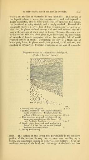 | Keywords: The Quarterly journal of the Geological Society of London (13937325291).jpg AT SAINT CROSS SOUTH ELMHAM IN SUFFOLK 507 <br> Aim is glutinosa L <br> Ceratophyllum demersum L <br> Alisma plantago L <br> Potainogeton heterophyllus <br> Schreb <br> perfoliatus L <br> crispus L <br> obtusifolius Mert § ¢ Koch <br> trichoides Cham <br> Zannichellia palustris L <br> Scirpus pauciflorus Light/ <br> Cfflspitosus L <br> fluitans L <br> lacustris L <br> Carex riparia Curtis <br> rostrata Stokes <br> Prom the same sample Mr Reid obtained two mosses which <br> Mr Mitton has declared to be ” <br> Brachythecium plumosum t <br> Amblystegium fluitans <br> And also the following Mollusca ” <br> Pisidium arnnicum Miill <br> a fragment <br> fontinale Brap <br> Tbalictrum flavum L <br> Ranunculus aquatilis L <br> sceleratus L <br> flanimula L <br> Crataegus oxyacantba L <br> Myriopbyllum spicatum L <br> Hippuris vulgaris L <br> Hydrocotyle vulgaris L <br> CEnantbe pbellandrium Lam <br> very small <br> Cnicus palustris HoffmP badly <br> preserved <br> Taraxacum officinale Web <br> Menyanthes trifoliata L <br> Lycopus europaeus L <br> Eumex maritimus L <br> Limnsea stagnalis L <br> Valvata piscinalis Mull <br> Bytbinia tentaculata L <br> Spbasrium corneum L <br> Some minute teeth and bones of vertebrates were also found <br> which Mr Newton has verified as ” <br> Arvicola sp vole Tinea vulgaris tench <br> Leuciscus rutilus roach Esox lucius pike <br> The same stratum contains abundance of wood and some time <br> ago the trunk and main branches of a forest tree Mr Aldous says <br> an oak were found imbedded in the loam <br> rTo palaeolithic implements were found at Saint Cross though <br> flint flakes and drippings more or less suggestive of human agency <br> are common in bed b On a recent visit to the brickyard a work- <br> man gave me a small cast bronze or copper adze which he had <br> obtained some years ago from bed c into which possibly it had <br> fallen from the surface of the section t I may mention here that <br> when the present series of excavations at Saint Cross was begun <br> it was found that the brickyard had been tenanted before by an <br> older generation of workmen A kiln filled with wood-ashes and <br> of a long obsolete pattern which had been completely buried and <br> grassed over was dug out and a quantity of abandoned brickearth <br> washed and utilized <br> Mr Reid seems to have found no trace of the hawthorn in any of tbe <br> postglacial deposits be bad previously examined See bis Notes on the <br> Geological History of tbe Recent Flora of Britain Annals of Botany vol ii <br> no 6 August 1888 <br> t Tbis species does not appear in tbe Rev E IS Bloonifield's list of the <br> mosses of Suffolk ” ' Journal of Botany ' August 1885 and March 1888 It is <br> usually found in Subalpine districts growing upon rocks and stones in damp <br> places Berkeley <br> j The Rev C R Manning F S A informs me that tbis implement is the <br> blade of a socketed celt broken off at tbe base of tbe socket of the common <br> type described by Dr Evans in Chap V of bis ' Ancient Bronze Implements ' 36940336 113696 51125 Page 505 Text 45 http //www biodiversitylibrary org/page/36940336 1889 Geological Society of London NameFound Alisma plantago NameConfirmed Alisma plantago NameBankID 1671647 NameFound Amblystegium fluitans NameConfirmed Amblystegium fluitans NameBankID 3334297 NameFound Arvicola NameConfirmed Arvicola EOLID 111244 NameBankID 2480523 NameFound Brachythecium plumosum NameConfirmed Brachythecium plumosum EOLID 862768 NameBankID 3872616 NameFound Carex riparia NameConfirmed Carex riparia EOLID 1123478 NameBankID 2777989 NameFound Ceratophyllum demersum NameConfirmed Ceratophyllum demersum EOLID 596653 NameBankID 2645283 NameFound Cnicus palustris NameConfirmed Cnicus palustris L Willd EOLID 468314 NameFound Crataegus NameConfirmed Crataegus EOLID 29927 NameBankID 2649819 NameFound Esox lucius NameConfirmed Esox lucius EOLID 206652 NameBankID 3863621 NameFound Hippuris vulgaris NameConfirmed Hippuris vulgaris EOLID 583132 NameBankID 2651056 NameFound Hydrocotyle vulgaris NameConfirmed Hydrocotyle vulgaris EOLID 596968 NameBankID 2663367 NameFound Leuciscus rutilus NameConfirmed Leuciscus rutilus EOLID 11088833 NameBankID 3861153 NameFound Lycopus europaeus NameConfirmed Lycopus europaeus EOLID 579749 NameBankID 2654982 NameFound Menyanthes trifoliata NameConfirmed Menyanthes trifoliata EOLID 584945 NameBankID 2653291 NameFound Mollusca NameConfirmed Mollusca EOLID 2195 NameBankID 230454 NameFound Pisidium NameConfirmed Pisidium EOLID 50249 NameBankID 2693599 NameFound Ranunculus aquatilis NameConfirmed Ranunculus aquatilis EOLID 473801 NameBankID 2645415 NameFound Scirpus pauciflorus NameConfirmed Scirpus pauciflorus R Br Poir EOLID 1119068 NameFound Taraxacum officinale NameConfirmed Taraxacum officinale EOLID 578234 NameBankID 2657720 NameFound Tinea vulgaris NameConfirmed Tinea vulgaris NameFound Valvata piscinalis NameConfirmed Valvata piscinalis EOLID 12003293 NameBankID 2683198 NameFound Zannichellia palustris NameConfirmed Zannichellia palustris EOLID 1116008 NameBankID 2659791 Biodiversity Heritage Library The Quarterly journal of the Geological Society of London v 45 1889 Geology Periodicals Smithsonian Libraries bhl page 36940336 dc identifier http //biodiversitylibrary org/page/36940336 smithsonian libraries Information field Flickr posted date ISOdate 2014-04-21 Check categories 2015 August 26 CC-BY-2 0 BioDivLibrary https //flickr com/photos/61021753 N02/13937325291 2015-08-26 05 51 35 cc-by-2 0 PD-old-70-1923 The Quarterly journal of the Geological Society of London 1889 Photos uploaded from Flickr by Fæ using a script |